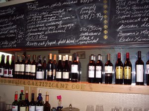 We asked how the place worked, and Dianna offered the details. You pick the wine, and she pours it. The wine is charged by the ounce, and the price per ounce is determined on the type of wine. She has a lovely menu of nibbly things – salami, olives, spiced pecans, truffled popcorn, bacon wrapped somethings (who cares? it has bacon), “really good bread” which we learned is from Tree Stone bakery (which does produce really good bread), an assortment of cheeses, and a few dessert items.