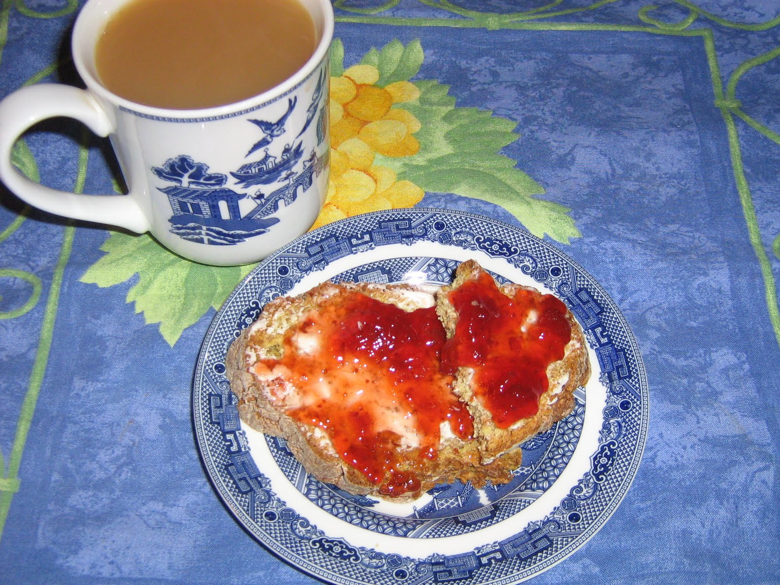 In our home, a tea thing could be either sweet or savoury: a wedge of cheese, a pastry, a piece of chocolate, a few cookies (bikkies as my hubby calls them), or a few wine gums. Whatever. It’s never a lot, just something to have with tea. My favourite is Irish Soda Bread, with butter and jam. Observe today’s tea (which has already been consumed and I’m already on cuppa number two):