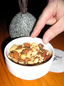Before dinner, we sat in the lounge off the lobby. Normally, we are there in the summer and sit outside on the patio overlooking Lac Beauvert, but this visit we were stuck inside, on a warm day, in front of a blazing fire in a fireplace that is the size of our apartment. What we were delighted to experience, which we have never experienced before at this place, or anywhere for that matter, is warm nuts! If it were cold outside, they would have even been that much more welcome. We had to word our question to the waiter very carefully about how he kept the nuts warm.