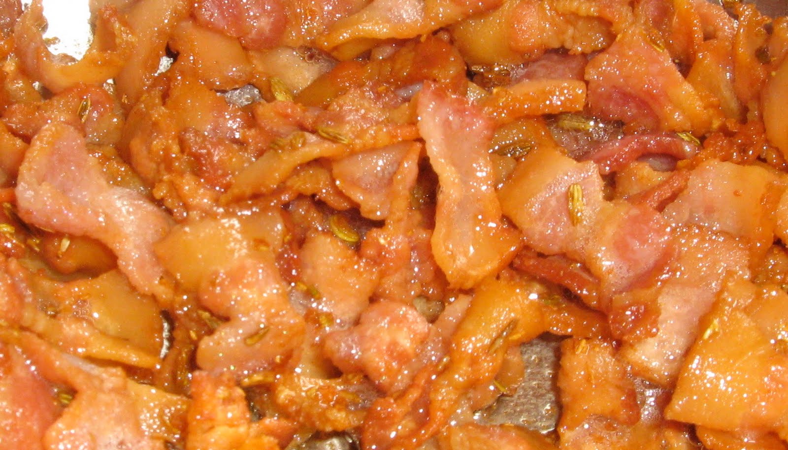 The recipe is as easy and as “gorgeous” as Jamie claims it to be (not gorgeous if you look at my picture above, but gorgeous to eat. The picture by David Loftus on Jamie’s site does it much better justice). The recipe is quite simply cooking up bacon in some crushed fennel seed. Add a sliced onion. Cook until golden and sticky (I loved that term). Add some diced apple, a chopped up head of cabbage, balsamic vinegar, salt, and pepper. Cook. Eat. The challenge? Not picking out and eating all the bits of bacon each time the lid is lifted to give the stuff a bit of a stir.