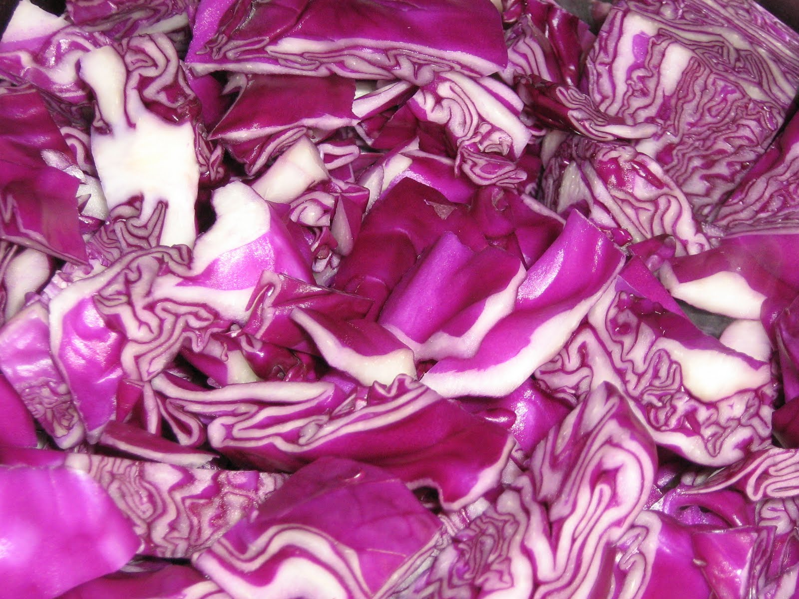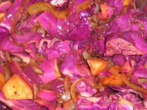 Today I was inspired to cook up this dish as a result of getting jostled around the blogosphere and finding myself at Jamie Oliver’s website. I was intrigued by his recipe, Braised Red Cabbage with Apple, Bacon and Balsamic Vinegar. First thought “bacon”, second thought, “a new way to eat vegetables”. So off I went to pick up a red cabbage out of the cabbage patch at Safeway, and to pick a package of porkie goodness.
