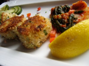 Next up were cashew crusted dungeness crab cakes, garnished with cucumber sunomona and kimchi. Now, if you shop at the Farmer’s Market in Old Strathcona, you know the Korean guy that sells kimchi. I’ve always by-passed this vegetable thing in favour of his deep fried whatchamacallits instead, which are yum-ola. After tonight, I might be buying the kimchi. I had no idea what I was missing. Spicy. Delicious.