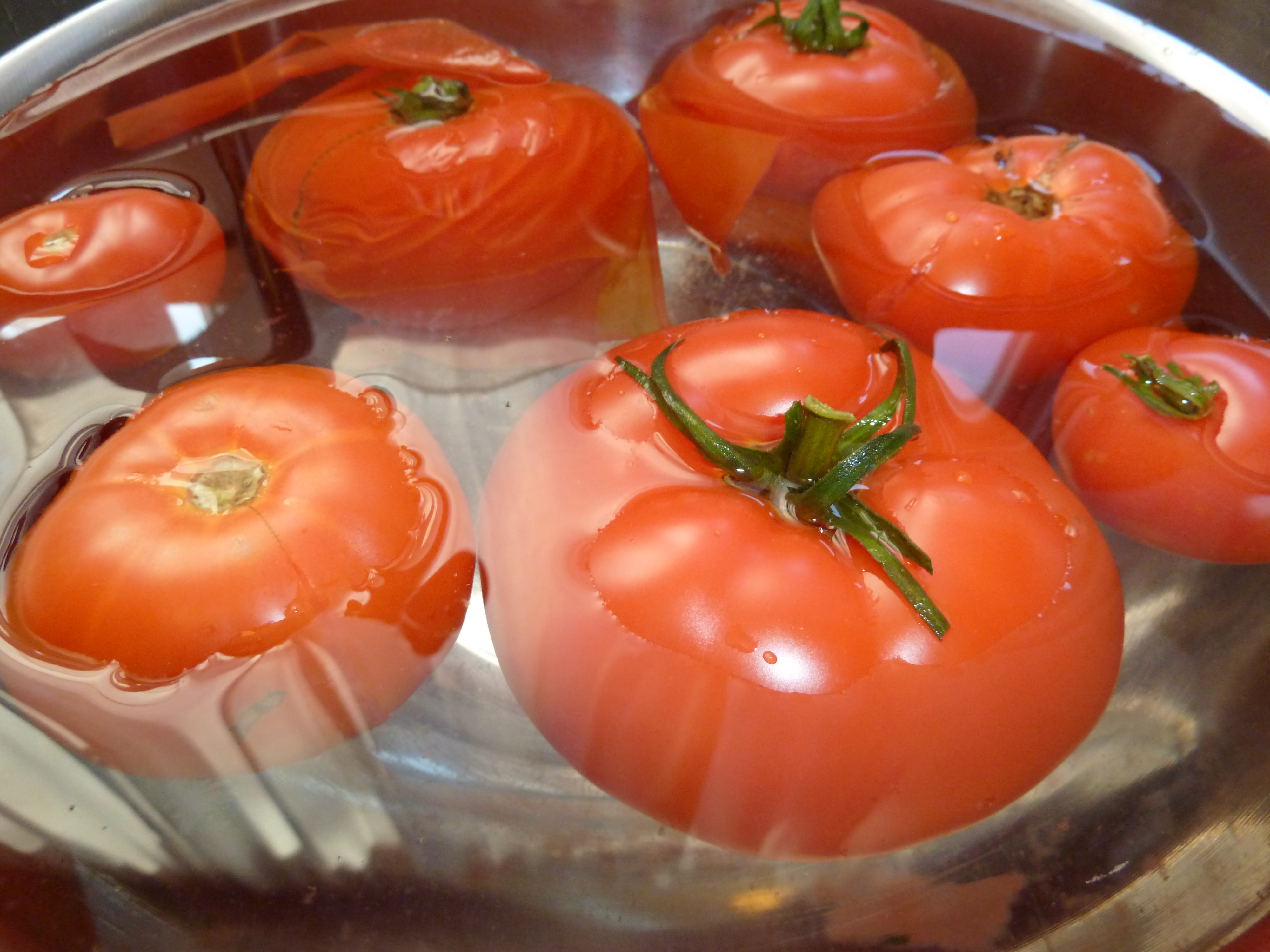 On the stove, I had gently cooking: onion, carrots, garlic and ginger. Whilst that was doing its magic, I boiled up some water and added about 7 assorted sizes of tomatoes. I had them burble away for about three minutes, and plopped the little beauties in a bath of ice cold water.