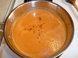 I did a rough chop of the tomato flesh, and added to the onionscarrotsgarlicginger mix on the stove. I added a bit of coriander, salt, pepper, and a dash of sugar, because somewhere in the back of my mind I can hear some TV celebrity chanting that tomatoes love sugar and you are always to add a bit of sugar to any tomato dish. I’ve done it forever because of this. Once blended together, I plop-plop-splashed-plopped the mix into the blender and gave it a good whir. And another whir for good measure, and one more just for fun.