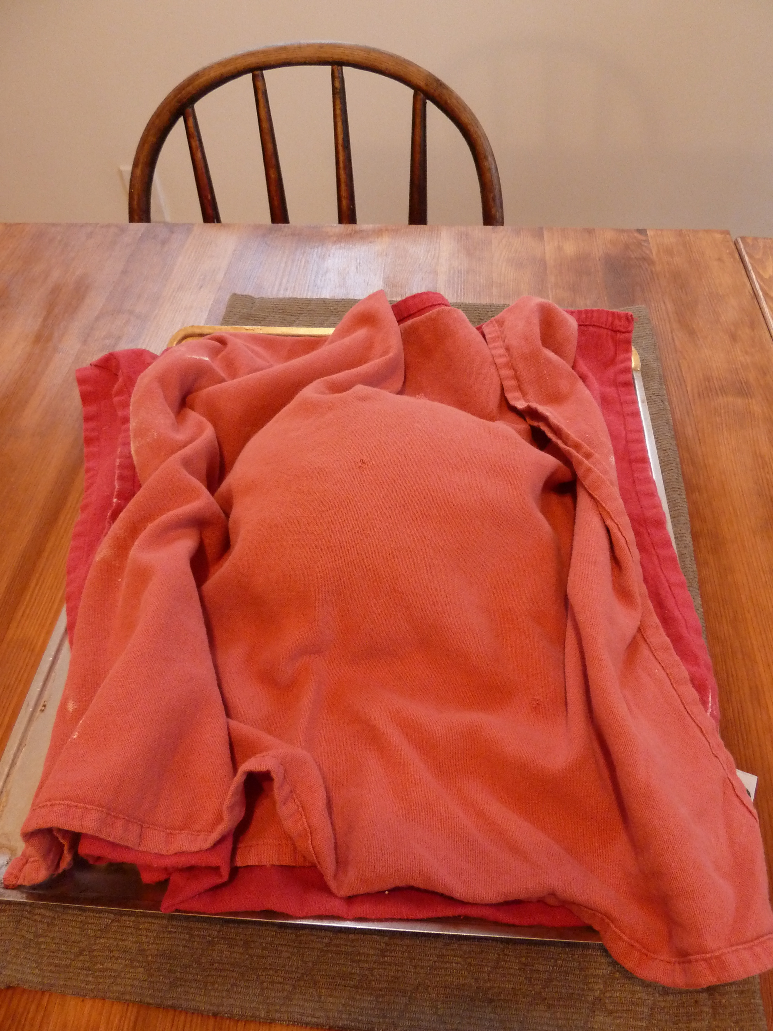 Remove the dough from the bowl and fold once or twice. Let the dough rest 15 minutes in the bowl or on the work surface. Next, shape the dough into ball. Generously coat a cotton towel with flour, wheat bran, or cornmeal; place the dough seam side down on the towel and dust with flour. Cover the dough with a cotton towel and let rise 1-2 hours at room temperature, until more than doubled in size.