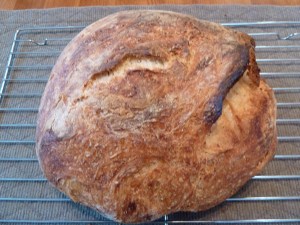 In 2006 The New York Times published a recipe for No Knead Bread from Jim Lahey of the Sullivan Street Bakery. I thought I’d give it a whirl. For added confidence, I also watched the video of Jim Lahey with Martha Stewart. If you watch the video, I hope you get the same amusement as I do watching Martha trying to make it more complicated by giving it an extra fold here, an extra pat there, etc. etc. In part two of the video, I also get some pleasure watching Jim Lahey boss Martha. Oh yes, the fun in the Walsh house never ends.