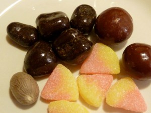 In this picture here, you can see our little selection. Grapefruit slices, chocolate covered cherries, chocolate covered ginger, and one little nutmeg that cost a whole 14 cents. What you don’t see is the large bag of steel cut oats we bought. We’ve both become a huge fan of steel cut oats, and advise you to stay tuned for a future blog post dedicated to this tasty whole grain.