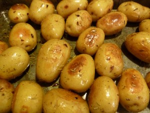 I should be avoiding starch and eating things like egg plant or beans or other things that are green or purple or orange, but Michael went shopping this past weekend and came home with a Costco sized bag of baby potatoes, so these little darlings are currently roasting in the oven. These potatoes are, seriously, god’s gift. You don’t need to wash them. You just need to toss them in a pan with a bit of olive oil, herbs, spice, whatever inspires you, roast at 425 for however long, and hey presto, you have the best potatoes known to man. Yum.