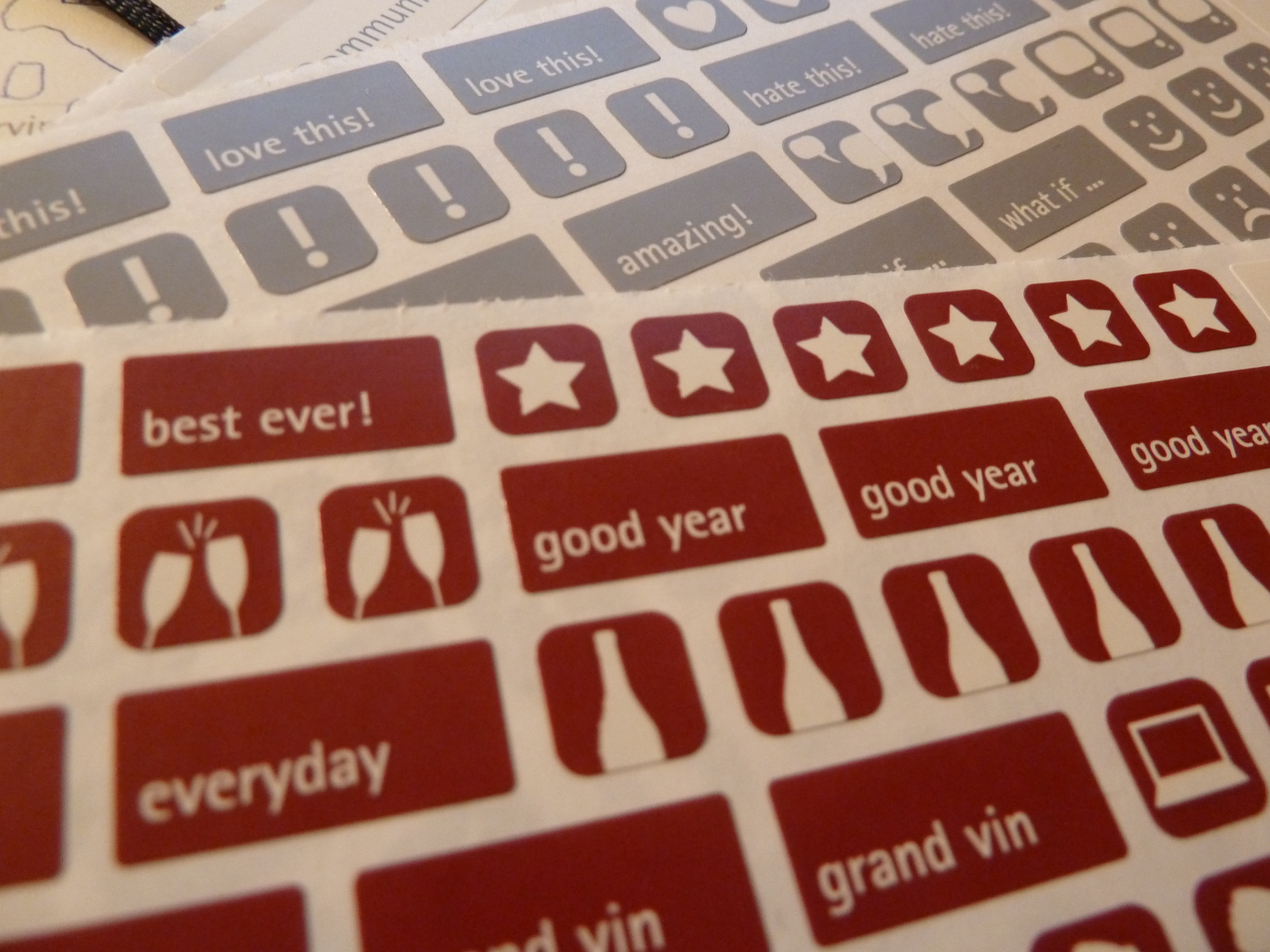 Stickers in red and gray to match the wine colour (the gray is for the white wine for those who just lost their squeaky toy under the couch). Stickers with hearts and exclamations, happy and sad faces, etc. etc. It is so much fun! It casts me back to days in the 1970’s when my parent’s would buy me a pack of stickers from the local Mac’s store after a swim class, to reward me for completing a class and a) not drowning b) not whining and probably c) keeping my bathing suit on while in the pool. The stickers back then said things like “Groovy” and “Cool” and were stuck on my binder covers, furniture and forehead.