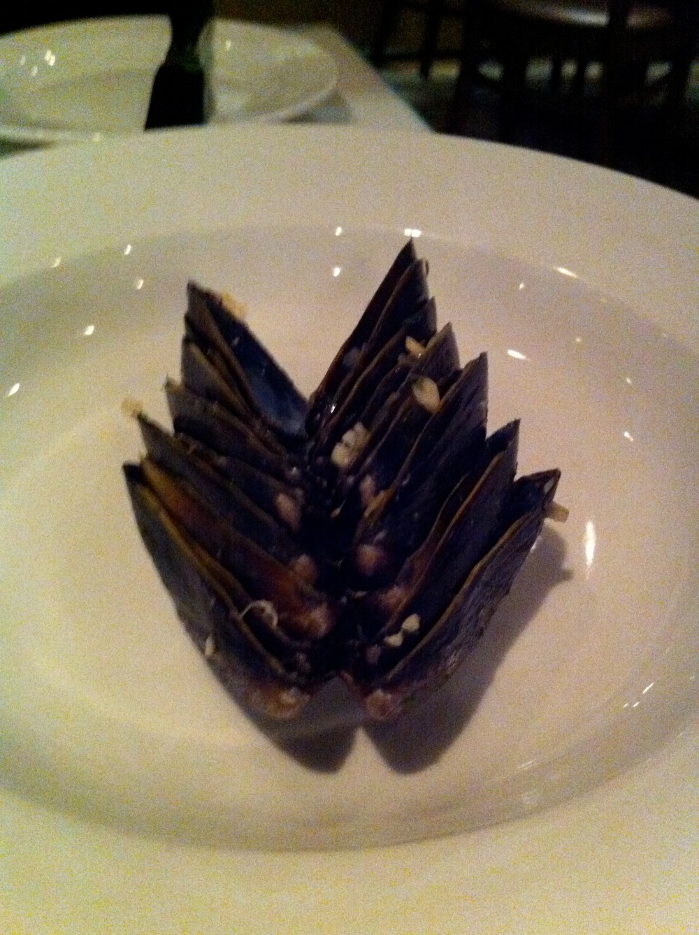 Michael chose to start with mussels that were served in a yummy, if not a bit salty, wine broth along with several pieces of toasted crostini. I tried one, and I will not say what I thought as I’m not into mussels in the least, but as Michael dug in and artfully arranged the empty shells, he was happily nom noming and sighing with enjoyment, with only one slight upset when he dropped a mussel on the floor and you could see him agonize about his loss.