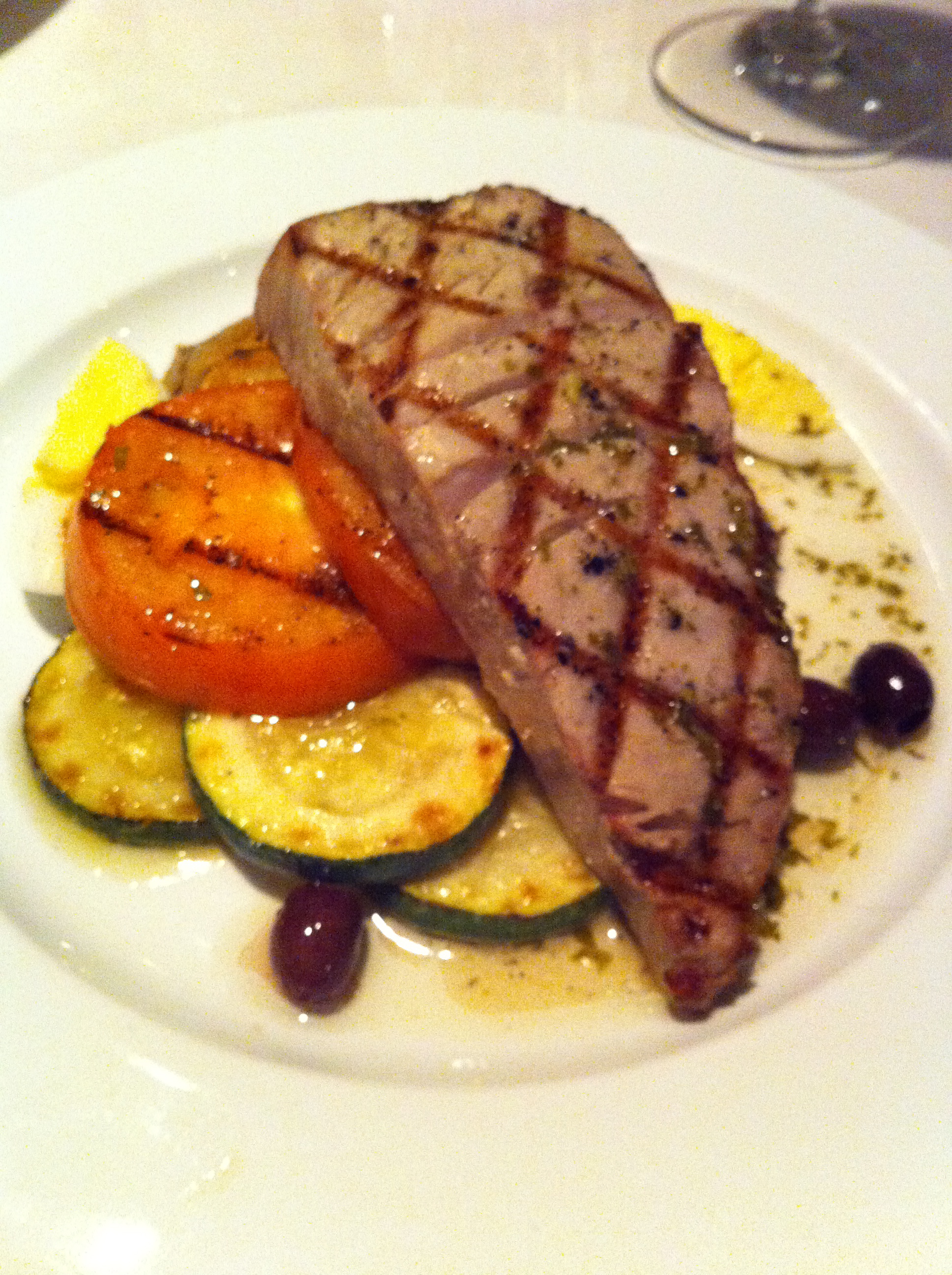 I selected the Ahi Tuna which was served with roasted veg and aforementioned tarragon sauce. Out of this world delicious. The plate was presented with sliced grilled tomato, grilled zucchini, adorable little black olives, and sliced egg. Oh allow me a moment to remember before I carry on….ย I’m back.