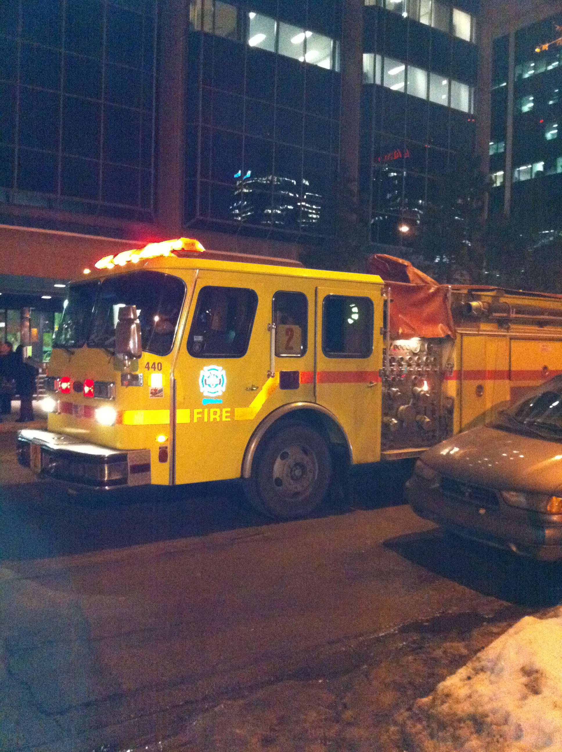 Well, after a few minutes people decided the alarm could no longer be ignored, and staff started to go outside to see what’s up, and next thing you know, we are being herding out of the restaurant onto the street. Within another minute or two the fire department arrives to do their thing. Patrons were huddled together on the sidewalk and the mood turned quite festive as it does when one thinks the building they are standing beside is going to burst into flames at any moment.