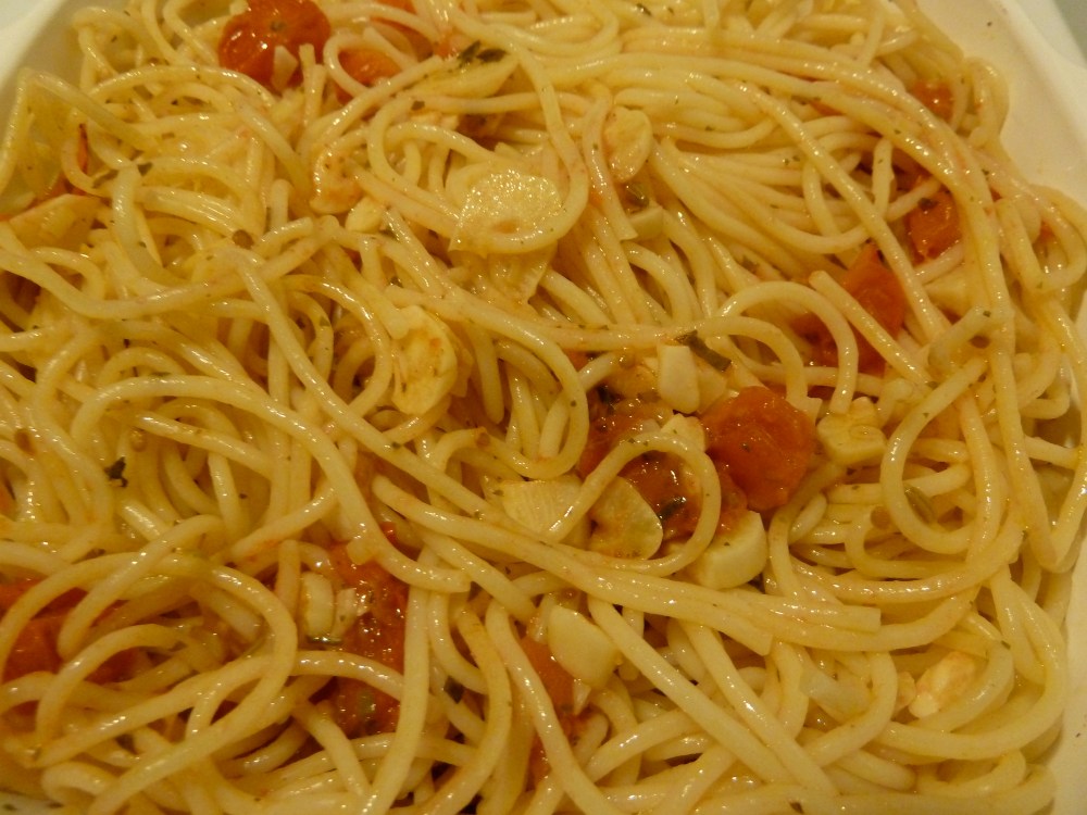 Friend Roxanne recently posted a recipe for “Spaghetti, Italian Style”. It’s a variation of the above, by adding cherry (I added grape) tomatoes in with the garlic, and a healthy bunch of pecorino cheese (I stuck with the parmigiana only because I invested a mighty sum of cash into the large wedge in the fridge). I was inspired by her post, and melded our two recipes together. Really, the thing is, you don’t need a recipe. Just toss stuff together until it looks like something you’d eat. Afterall, there will be as many versions of this dish as there are Italian hand gestures.