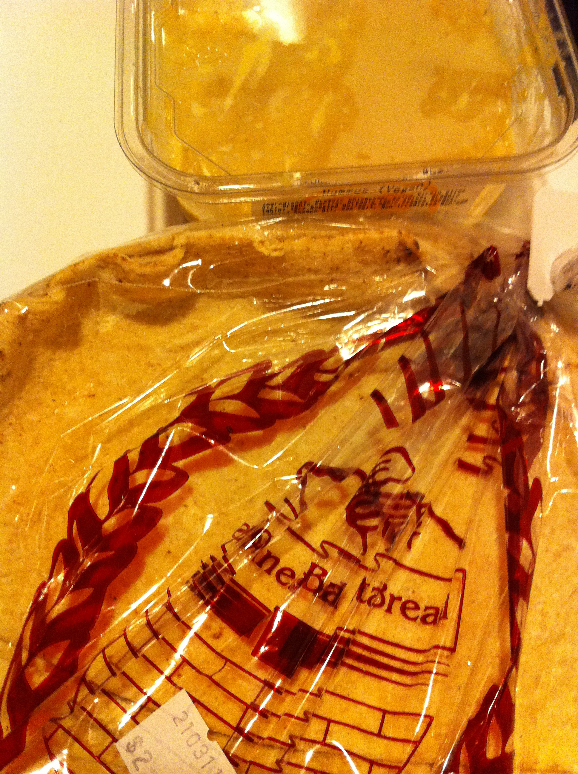 I needed solace. And what pops in my head but a McDonald’s hamburger. So, I obey my head and drive towards the nearest McDonald’s. But what’s that? Just in front of it? Planet Organic. *snap of fingers* That’s what I need! Something organic. So I do a two-wheeled screechy turn into Planet Organic’s parking lot. Dash in and out with a tub of hummus and a bag of whole wheat pita, race home (avoiding pot holes and pools of water with uncertain depth), open the bag of pita, take out one piece, rip into pieces, open tub of hummus and let the dipping begin! I felt healthy, whole and freshly organic myself – pleased that I wasn’t stuffing my face with a hamburger, which would lead to another one, fries, and a half a package of chocolate covered Hob Nobs.
