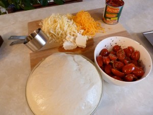 That is pizza dough, risen to the perfect height, some grated cheese, and grape tomatoes, sliced and tossed with garlic, basil, oregano and few fennel seeds.