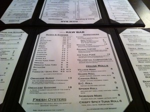 The first impression is the size. This location used to house a series of night clubs, and unfortunately, that feeling has remained. Other than a few token pictures on the wall, a piece of Japanese music on repeat over the speakers, and the dress of the cooks for the Teppan-yaki, there is nothing Japanese about Japanese Village. The focus of the gigantic room is the central bar, shown above. This would have been the perfect place to put the sushi bar, but alas, that got tucked to a back corner.