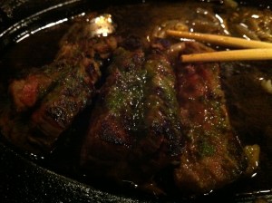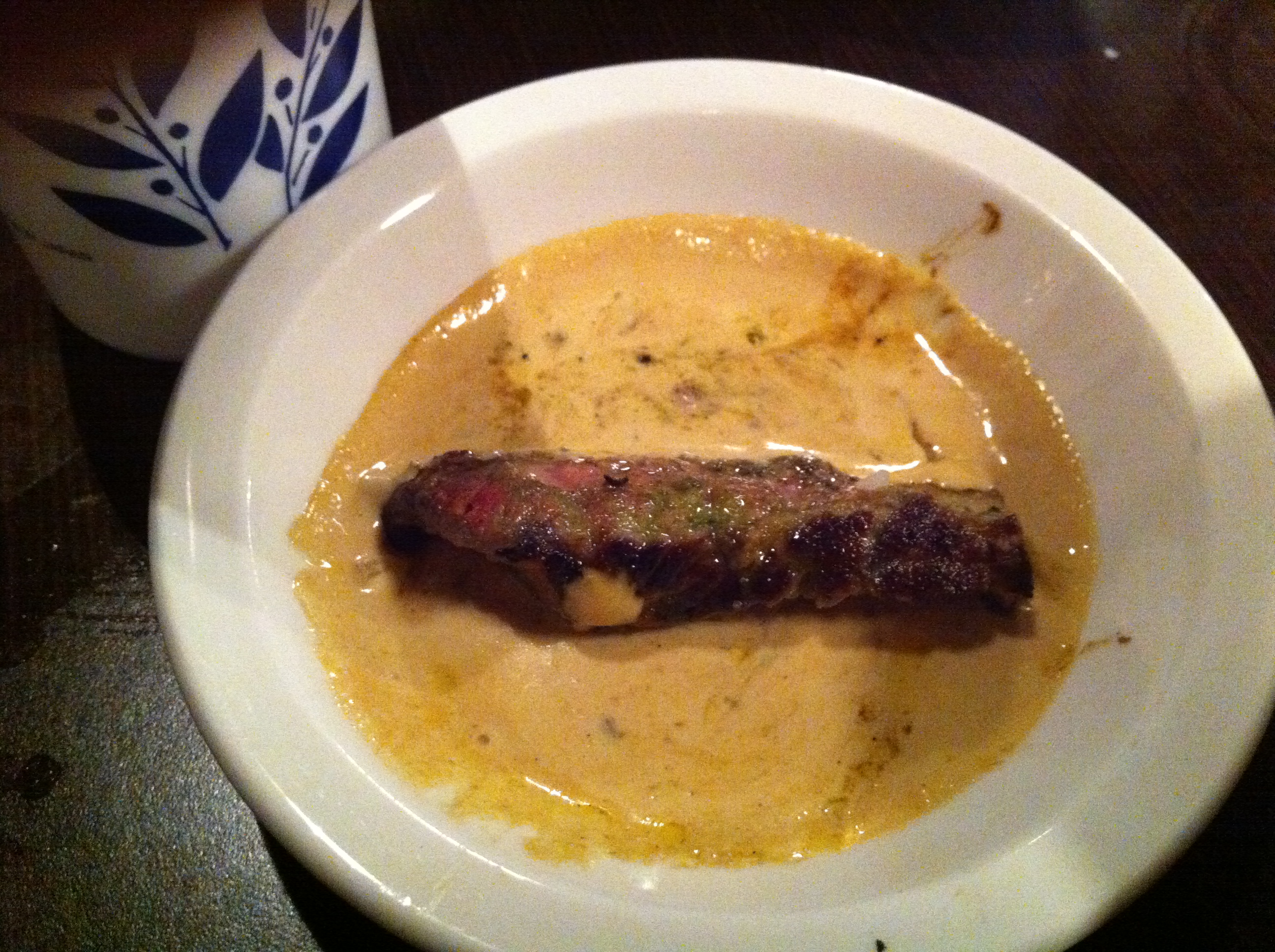 Today we went with steak in mind, and started with the wasabi tuna. You can see it above. It is raw tuna with a delicious wasabi sauce – wasabi mixed with their world famous steak sauce. The sauce didn’t disappoint us, but unfortunately, the tuna did as it was still frozen in the centre. We shrugged and renamed the dish Tuna-cicles.
