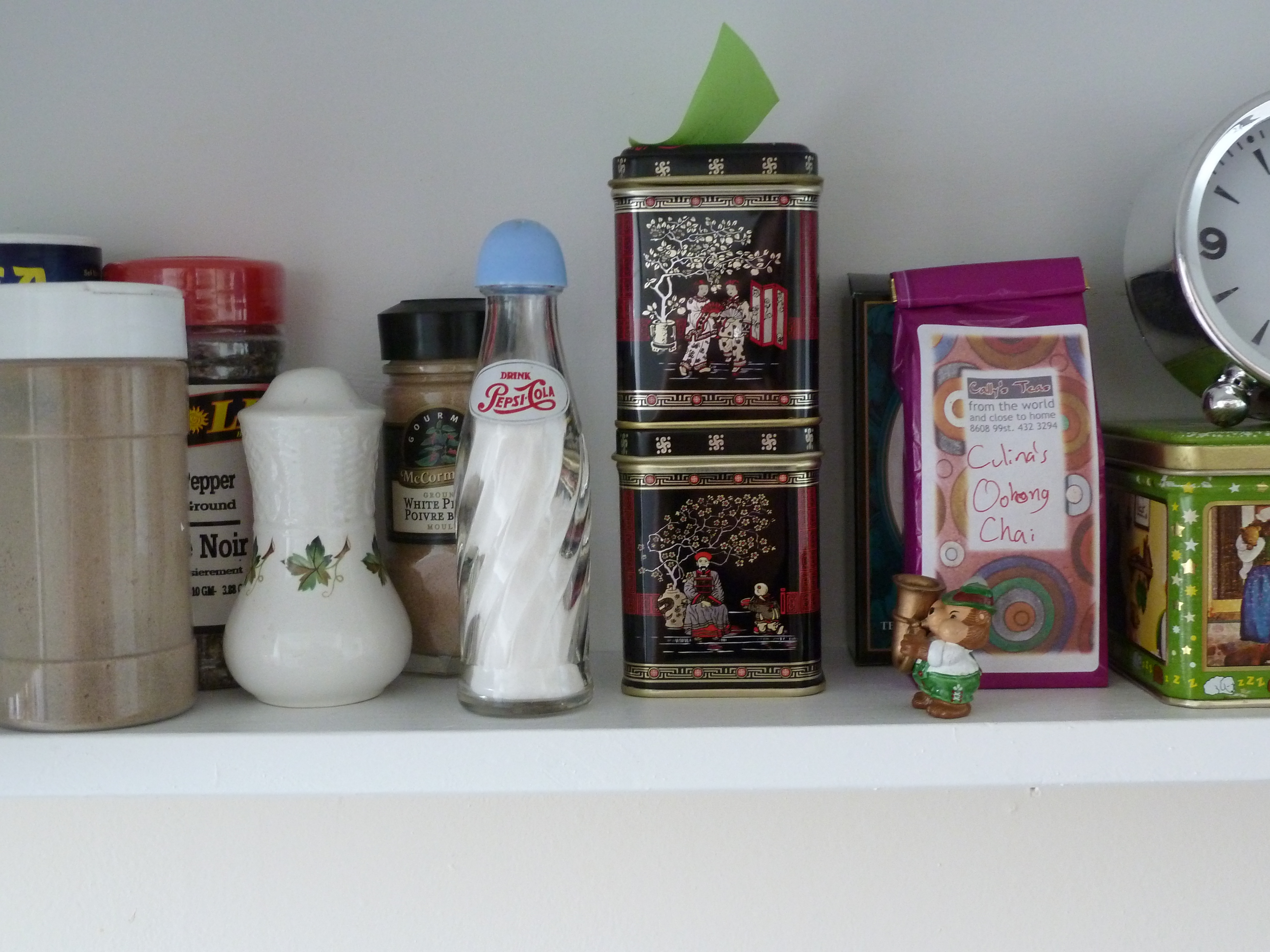 Here’s my little spice/tea shelf above the sink. A handy little feature that makes me happy: