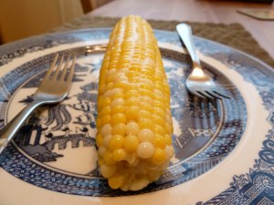 – If you are a back water hillbilly like me, pick up the corn with your hands, and eat it, left to right or right to left. I call this the Typewriter Method (TM). It’s best when the butter drips down your arms, while your husband is watching. It’s even better when you get bits of corn stuck in your teeth and you pretend you don’t know.