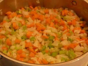 Lentil dahl, my version, couldn’t be easier. Start with your holy trinity of onion, carrots and celery. Saute until soft.