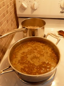Add garlic, chopped ginger (I use the jarred stuff, my being can’t chop ginger into fine enough pieces). Add generous spoons of curry and cumin. Add enough boiling water or vegetable stock (I use Knorr Vegetable Stock Mix) to cover generously. Hard to measure this, but I would guess about 2.5 cups worth. Add 2 cups green lentils. Salt and pepper taste. Let the whole works simmer on the stove for about an hour.