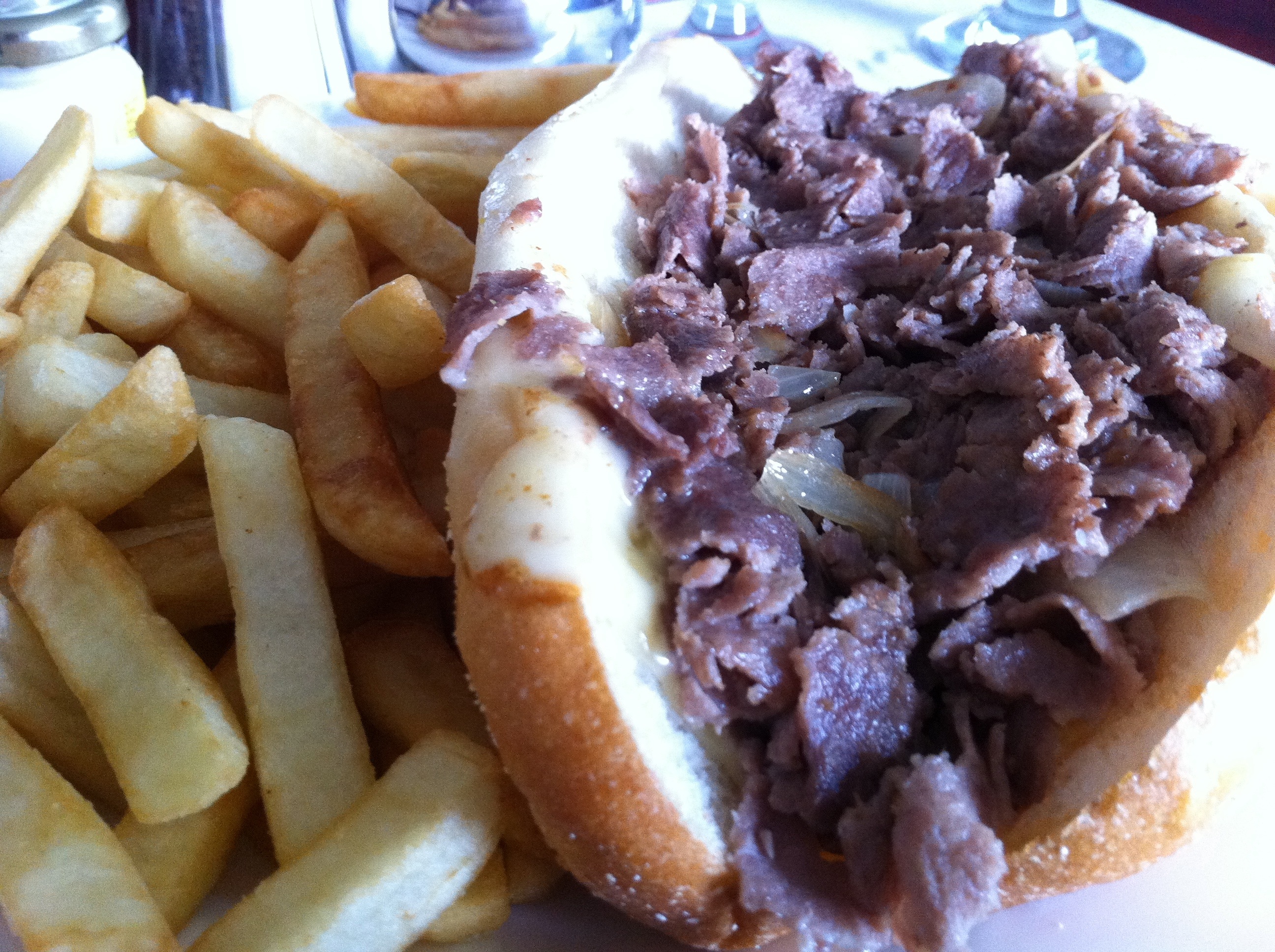And finally, I tried a Philly Cheese Steak. Short description: think beef dip without the dip. Add cheese and grilled onions. Super messy to eat. It’s the grease. Wikipedia offers a great run down and history of the Philly Cheese Steak. What’s important to know is this: It was created in Philadelphia. Like everything, there is an argument about the “best” way to eat it. On one side of the street, you eat it with provolone cheese. On other, American cheese, or, I was horrified to read, Cheez-Whiz. As popularity of the cheese steak grew, people started fancying it up with things like grilled green peppers, and mushrooms. I kept my sample basic and original. I liked it so much, I had it twice while in Philly. My photo does NOT give the sandwich justice at all. But trust me, you are looking at a plate of pure deliciousness there. *smack smack*