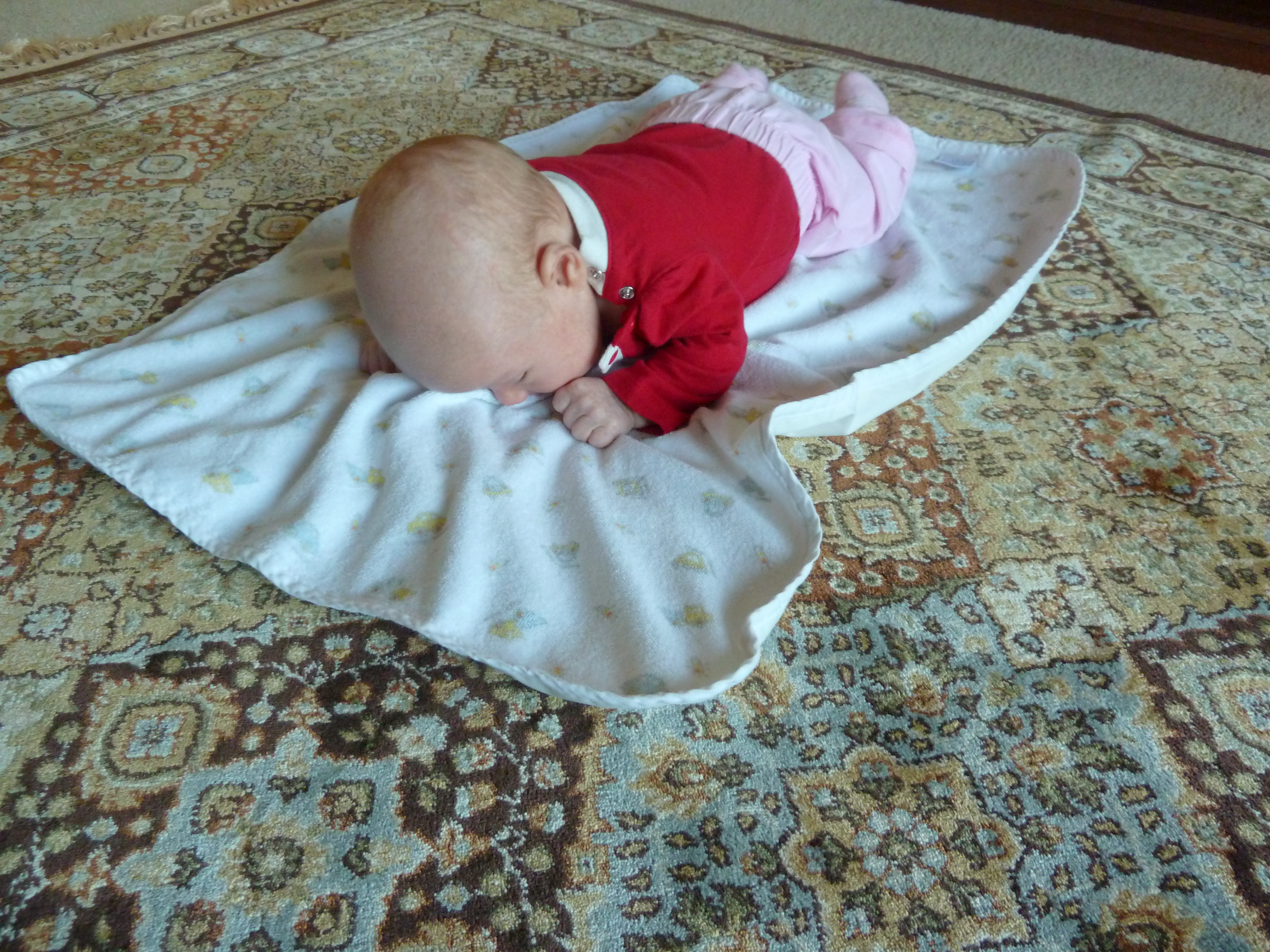 And, because we are on the topic of couscous, which is the teensiest of pastas, it makes me think of my newest cousin who is the teensiest of humans. This is my cousin at 5 weeks old (last week). This was a BIG MOMENT in her little life. She apparently raised her head more than she ever had! I have taken a picture of this very moment!