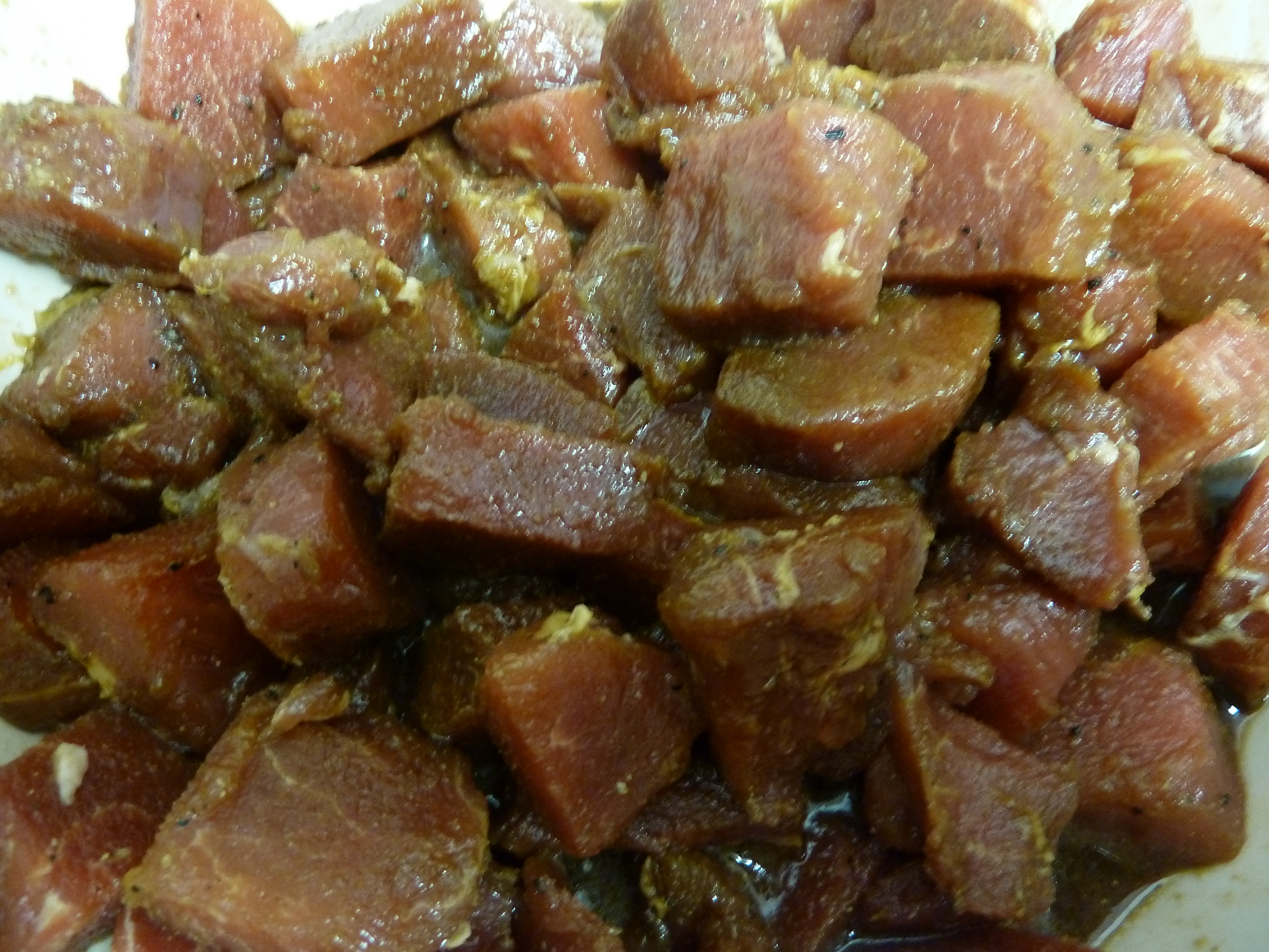 The pork. Marinate cubed pieces of pork tenderloin in a mixture of mostly Ketjap Manis, a bit of oil, garlic, ginger, pepper, lemon zest and lemon juice. When sufficiently marinated (a few hours or a day), skewer on wooden sticks with pieces of lemon. Broil until done.