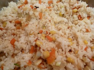 The rice pilaf – cook a pot full of long grain rice in chicken or veggie broth. Meanwhile, chop an onion, a few carrots, a bit of celery, a red pepper, garlic. Cook up in a little bit of oil until soft and golden (my friends tomorrow will see some bits that are black, and that’s the result of spending too much time on the computer and not in the kitchen). Perfection is for fools anyway. Add a bit of thinly slice green onion and frozen corn. Cook until the corn isn’t frozen anymore. Mix the rice and veggie mixture together.