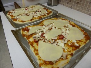 Normally, it’s just a simple pizza sauce and mozzarella. Some days I brown some ground beef, onion and mushrooms, and top with mozzarella and feta.
