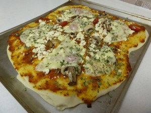 Whenever you are ready, take the dough out of the bowl and divide in two for a thinner crusted pizza, or plop the whole thing on a large baking sheet (lightly buttered or olive oiled) and then flatten it out until it resembles a pizza crust. (For the uninitiated, work your way out from the centre of the dough, towards the edges).