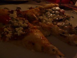 Tonight is the night of experimentation, and the plan was to top it simply with sun-dried tomato pesto, feta, and some provolone. But as luck would have it, my camera battery also died, so while I wait for that to charge, I’ll chop up some fresh tomatoes and mushrooms to add to the mix.