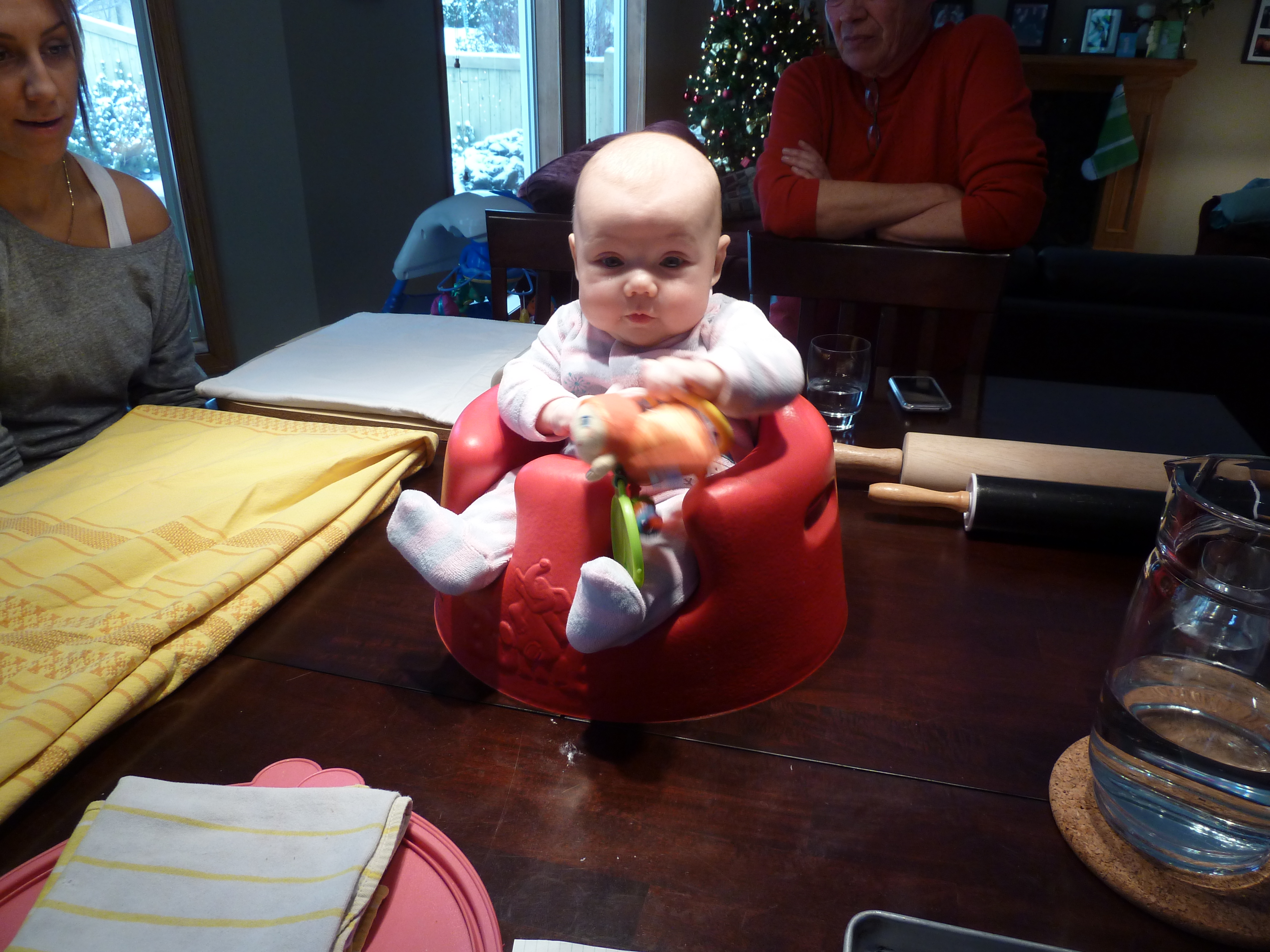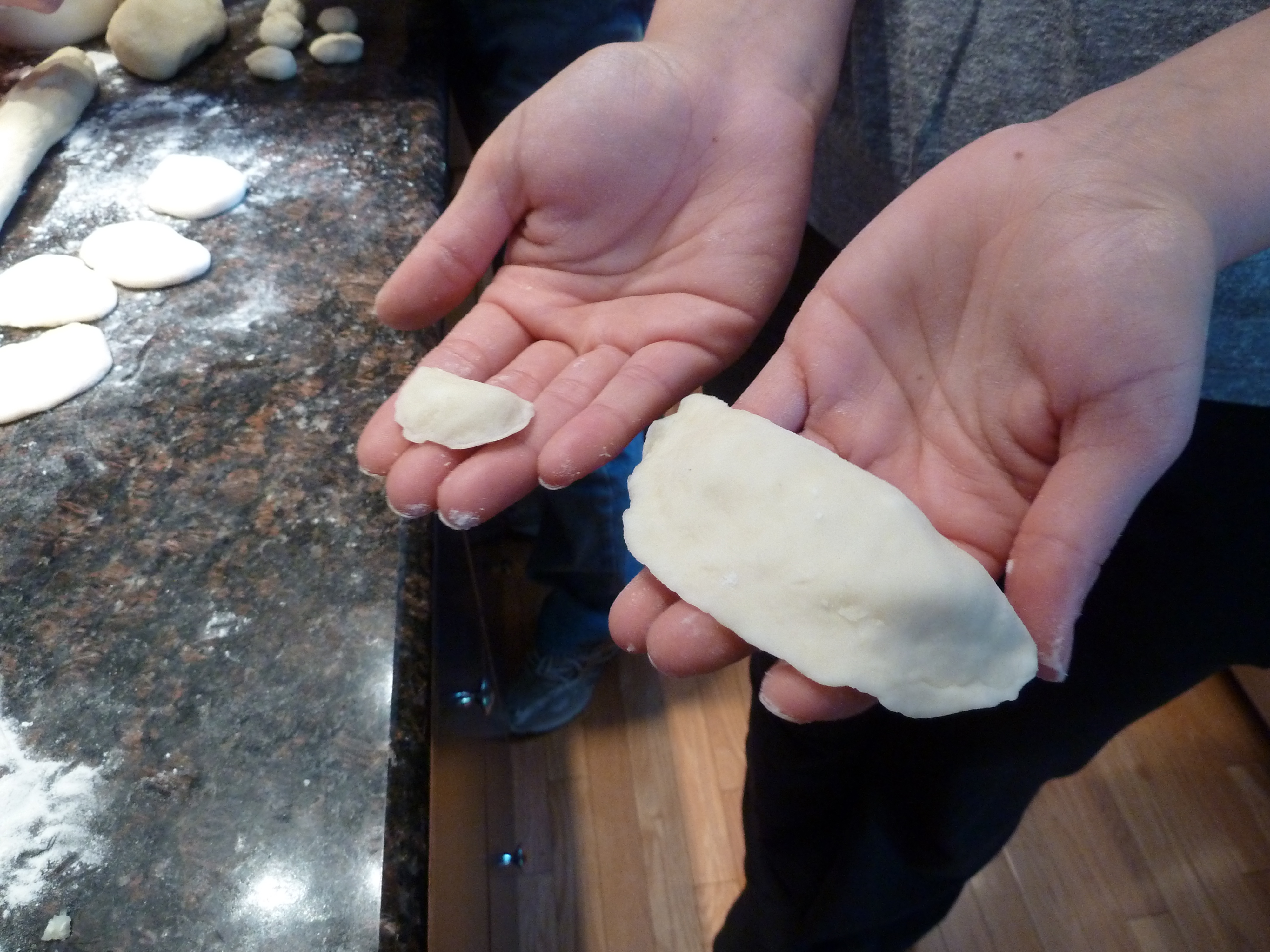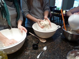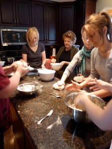Today, seven of us stood around the the granite counter, and keeping in mind the realities of living in 2012 where people don’t have 6′ freezer chests in their basements anymore, we made a modest amount of dough each: