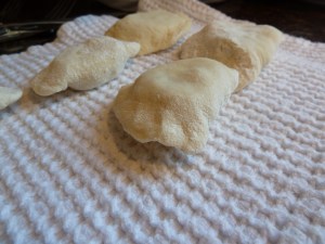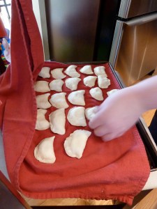 We had a riot making our dough. We are a competitive bunch, so we had to compare by poking each others dough. We chatted and laughed and worried about the method. One cousin-in-law pleaded complete exhaustion after mixing the dough. Another cousin thought they could manage if they could fill just three perogies each day. One cousin invented the “diet” perogy, and the mythological “big” perogy that our Baba threatened to make, but never did.