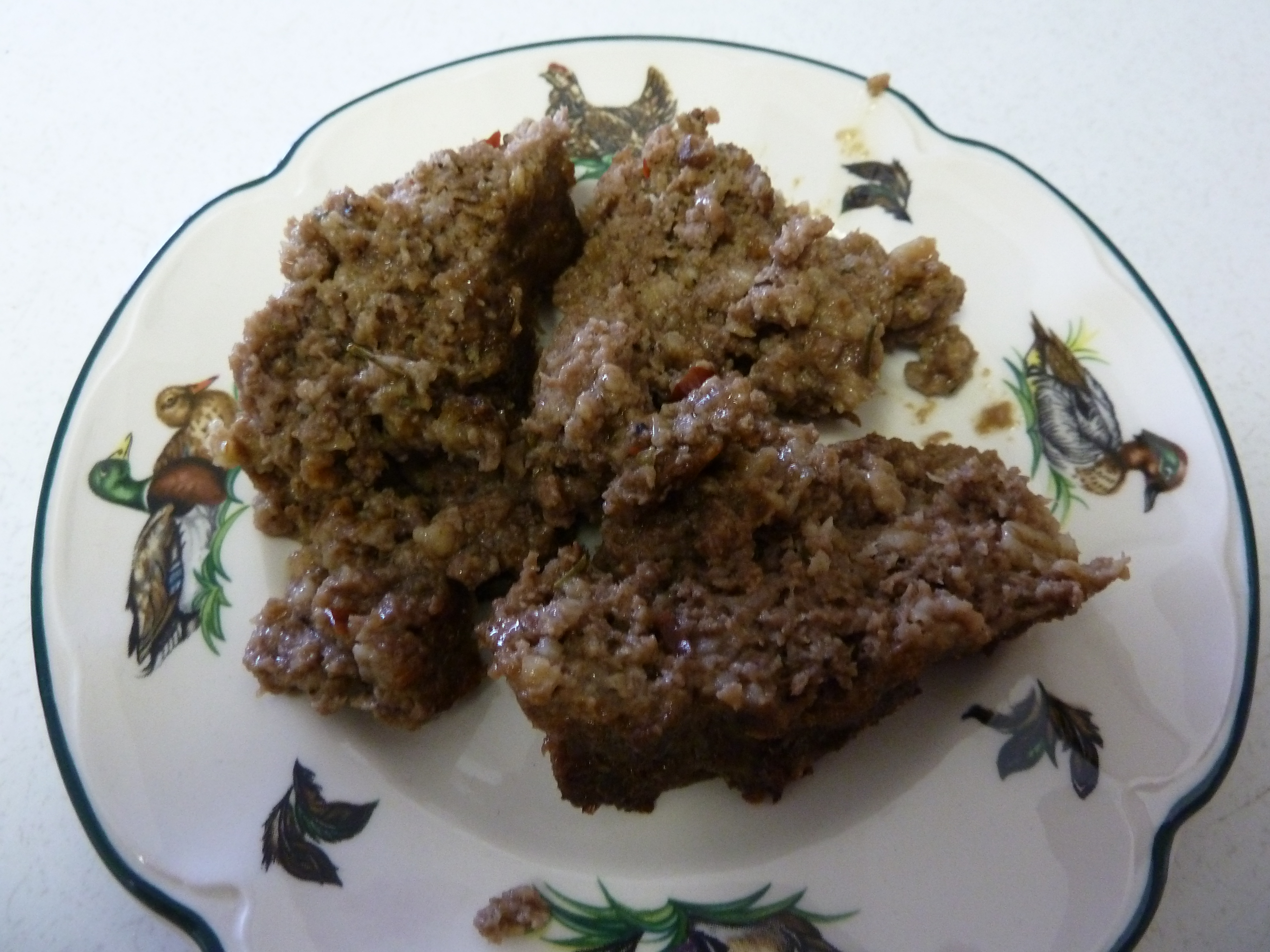 I mixed together the ground beef, eggs, breadcrumbs, oatmeal, onion (whizzed, as I am not a fan of crunchy onions), salt, pepper, marjoram, rosemary, fennel, thyme, oregano, garlic, basil, a dash of cinnamon, cayenne, chili peppers, ketchup, HP sauce, Worcestershire sauce, and balsamic vinegar. The entire works are plopped in a loaf pan, patted down with love, and cooked at 350F for however long (yes, I am that relaxed about making meatloaf now).