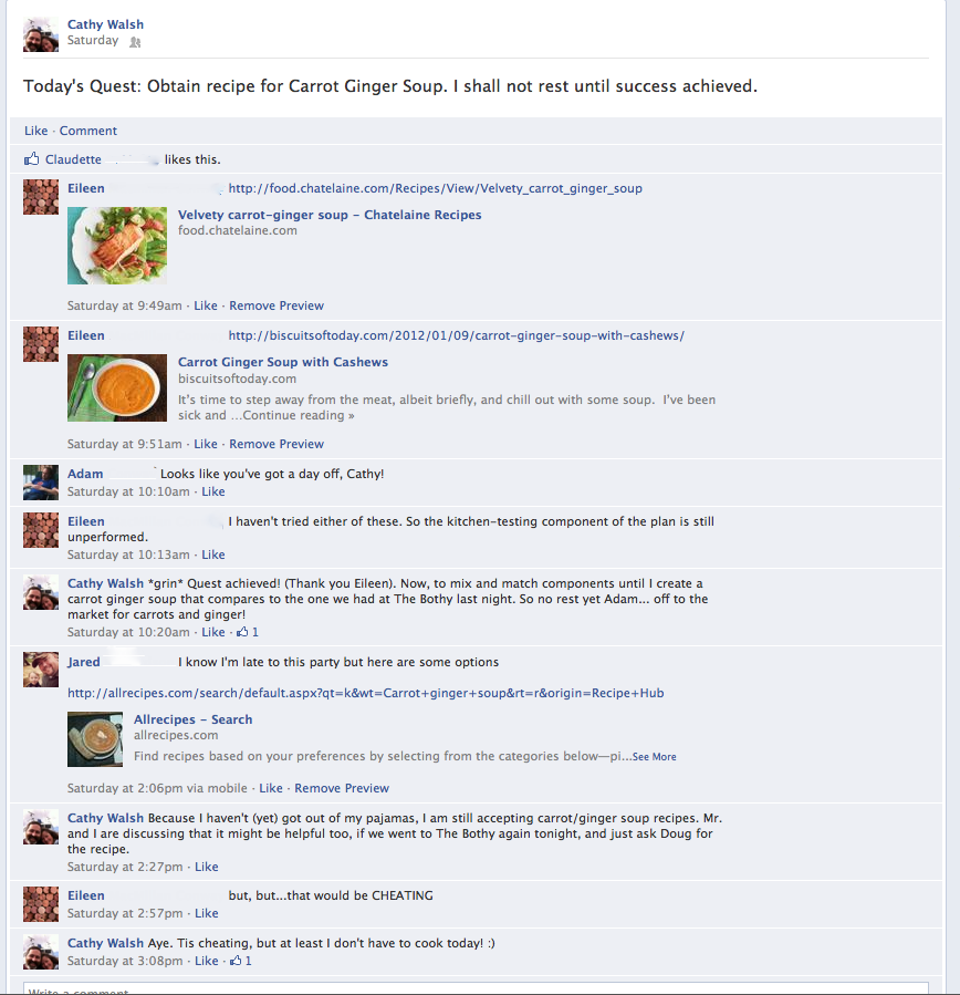 It was so delicious, the next morning I was on a quest for a recipe for Carrot Ginger soup. I posed the question on Facebook, and with the lovely friends and relatives that I have, I received a plethora of recipes. Some tried and true favourites, others the result of a Google search, etc. etc.