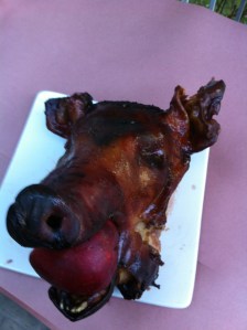 On the menu? Pig! Not a few bucks worth of pig wrapped in cellophane on a foam tray with a moisture absorption pad like I’m used to at my local Soby’s, but a whole pig… including its head, all four legs and tiny little tail all trussed up and getting roasted.