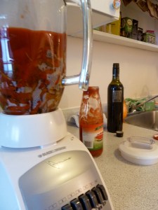 Crack open a bottle of strained tomatoes, or diced tomatoes, or tomato sauce. Whatever you have. Ketchup won’t work. Just saying. Pour a bit of this in the blender if your blended veggies are a bit thick. But don’t tell your vegetables you think they are thick. They will be offended because vegetables can be sensitive that way.