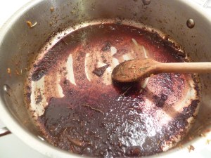 Meanwhile, back to the pan, you should have some sticky vegetable goodness on the bottom of the pan. Splosh a glug of red wine (or water, or balsamic vinegar) into this sticky goodness, let it burble for a second or two, then stir to pick up all that flavour.