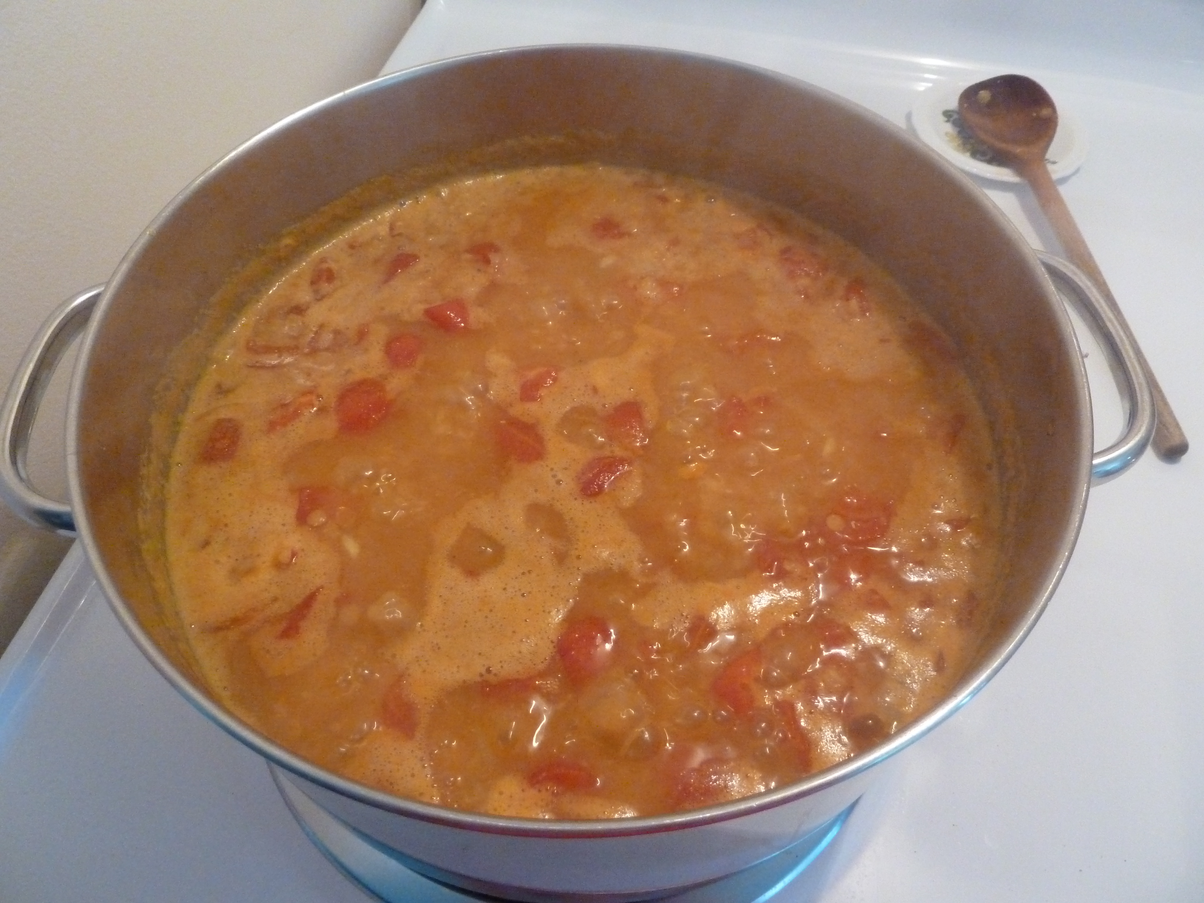 Let this simmer for 25 minutes, and when the red lentils are soft, add (after vigorous shaking) the can of coconut milk.