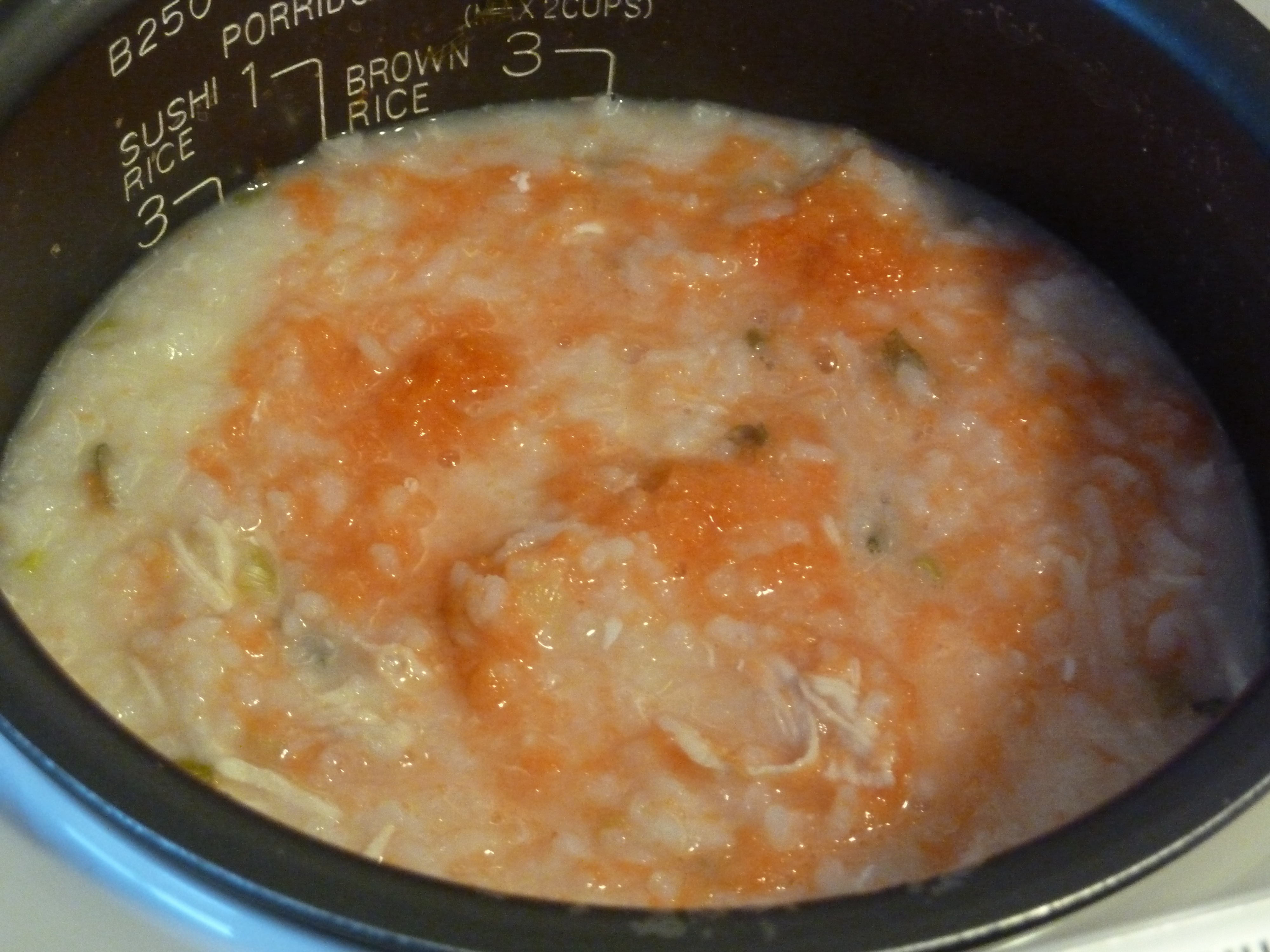 When the rice cooker sang out the hit song “Amaryllis”, I added a few more ladles of chicken broth from the poached chicken to give it a soupier texture. Then, I mixed up about a tablespoon of miso paste with a ladle full of chicken broth, and added it the pot. Next up, using chopsticks, stirred in the beaten egg. Then mixed in the chopped green onion, chicken, and carrots.