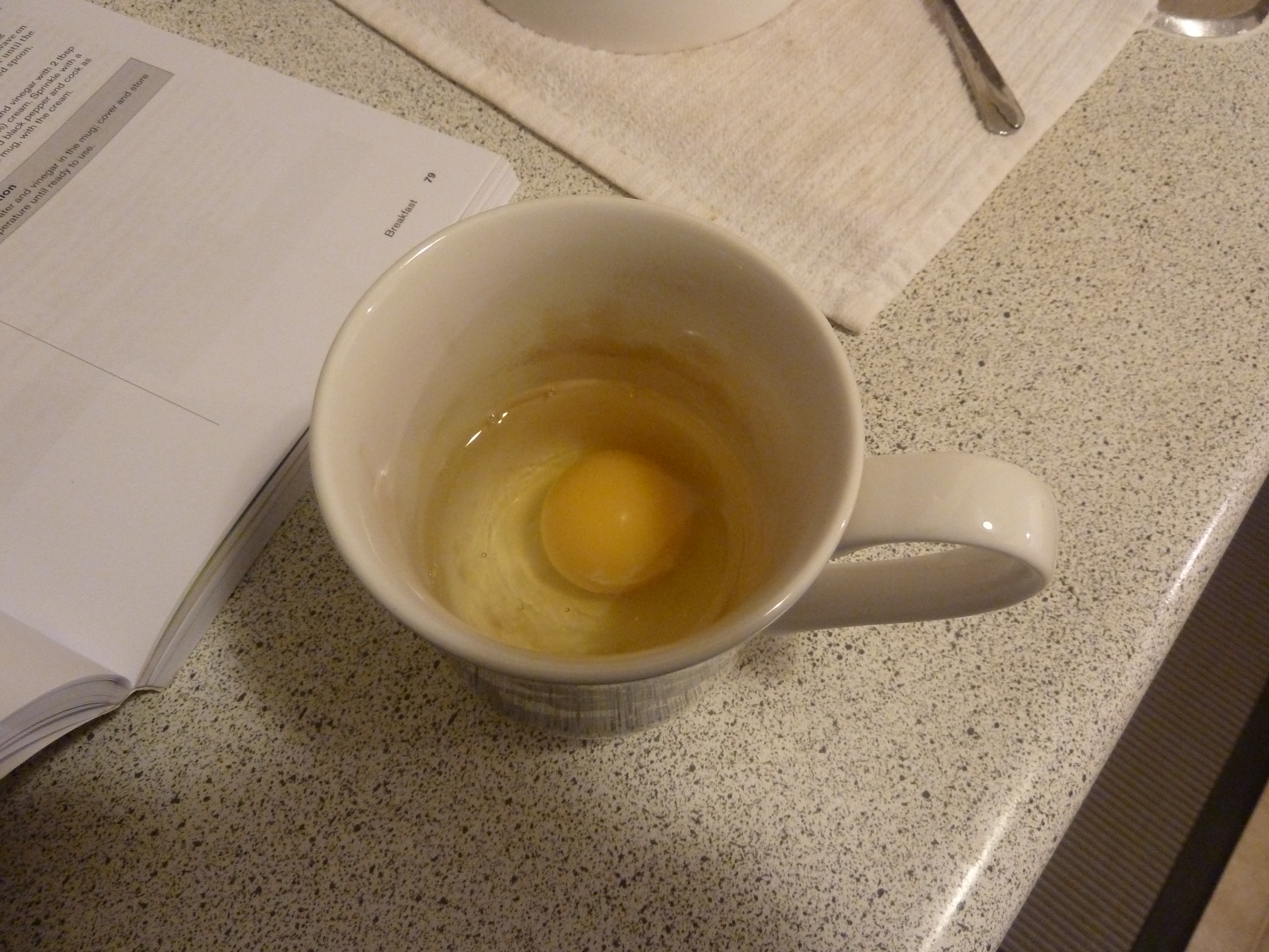 The first recipe I tried was poaching an egg. In a mug of water. With a bit of vinegar. In the microwave. Because of special laws and regulations I cannot share the method with you because that would be WRONG in the eyes of the publisher and the author. But I can tell you this. It was as simple as putting a bit of water in a mug adding a drop of vinegar and adding a cracked egg. Then putting it in the microwave. The result of my first attempt was PERFECT, providing you like a hard egg yolk. My second attempt had a softer yolk, which is my preference. Poached eggs are vexing, and I’m more than happy to continue my quest for the perfect poached egg. Here’s a picture of my first poached egg attempt using the instructions in the “250 Best Meals in a Mug” cookbook: