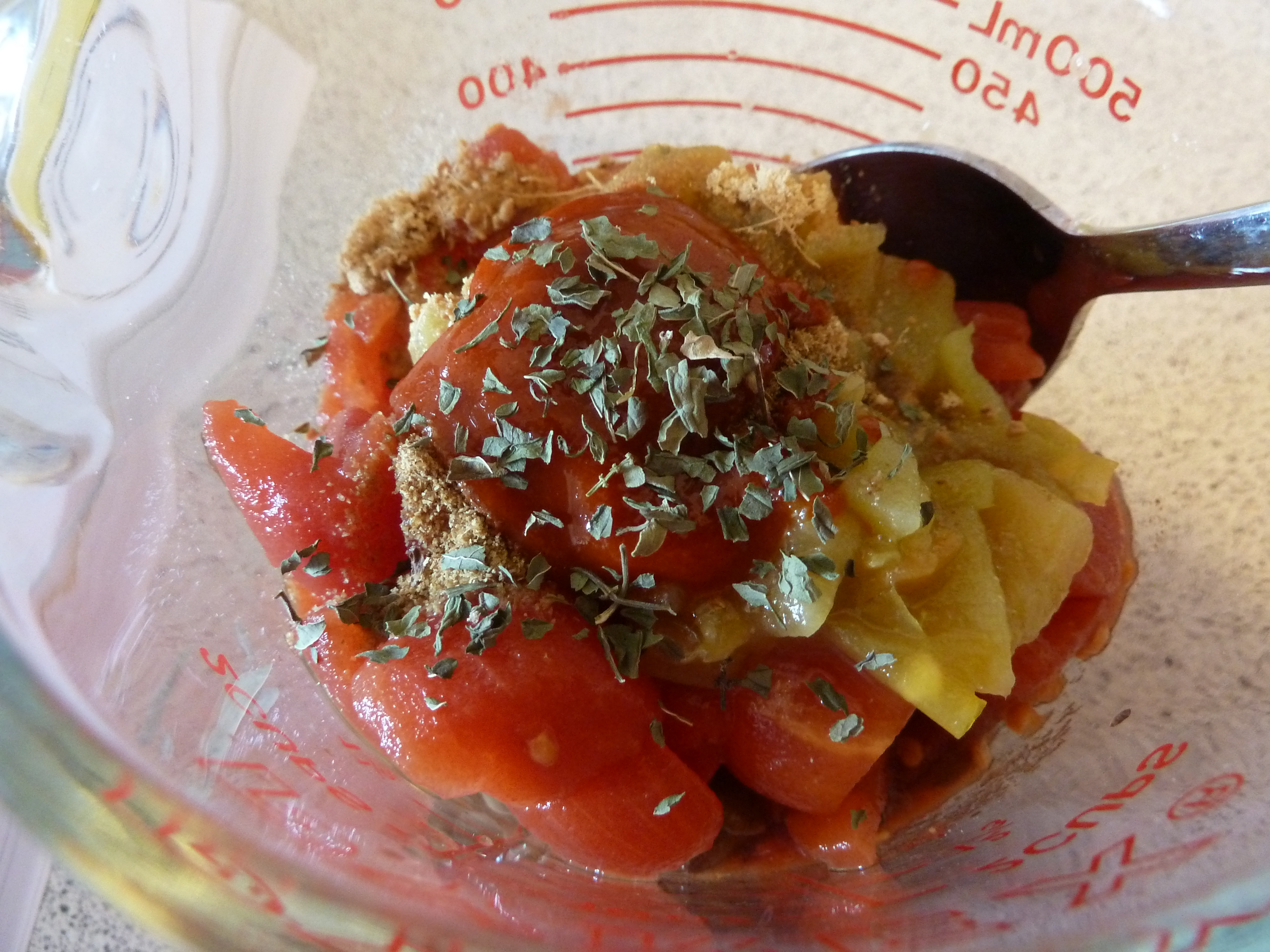 I need to explain that I don’t have a mug (16 oz) big enough to make these meals in. But I do have a 2 cup Pyrex that works beautifully. I also couldn’t find diced tomatoes with chilies. Instead, I used one of the many abundant cans of plain diced tomatoes I have in our storage cupboard sort of in Mormon fashion, “just in case” of alien invasion, end of man-kind, Revelations sort of action. I mean, a girl has to be prepared, and nothing says prepared more than a storage cupboard full of canned diced tomatoes. Anyway… as I have many cans of diced tomatoes, I didn’t really try that hard to find diced tomatoes with chilies. Instead, I picked up a small tin of jalapeno peppers in the Mexican section of the grocery store. I diced these up and added it to the diced toms. I mixed the stuff up, stuck it in the microwave and cooked it. Here’s the end result (without the yogurt… I’m on a dairy free kick right now):