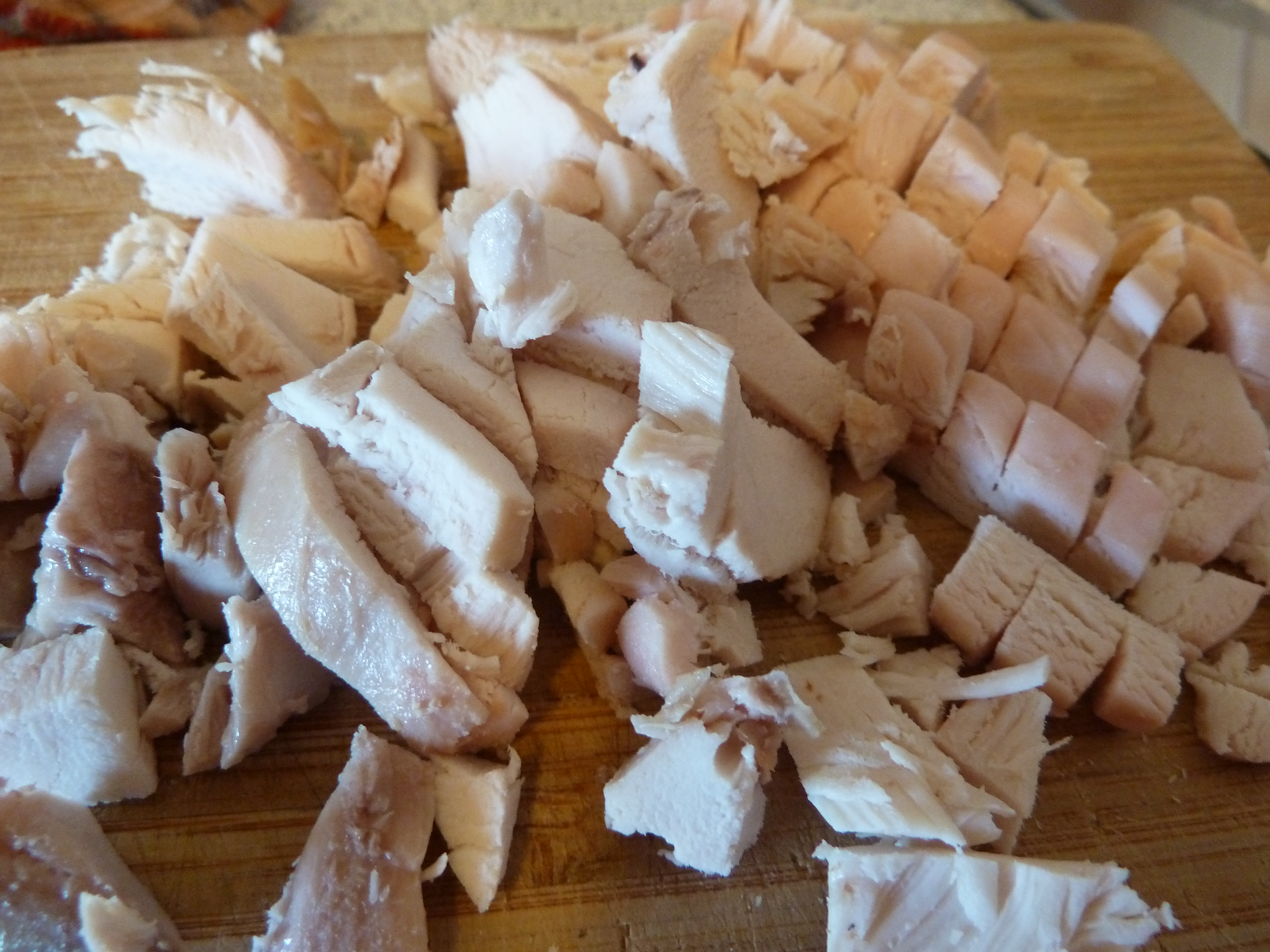 Cathy back….. canned chicken creates too much of a negative visceral reaction, so I opted instead to buy one of those pre-cooked chickens you see/smell at the entrance to Safeway. To you, mass cooked Safeway chickens might cause an unpleasant visceral reaction, so IF you have the time and money, cook up your own free-range, hormone free, angel kissed chicken, and use the left overs for this recipe.