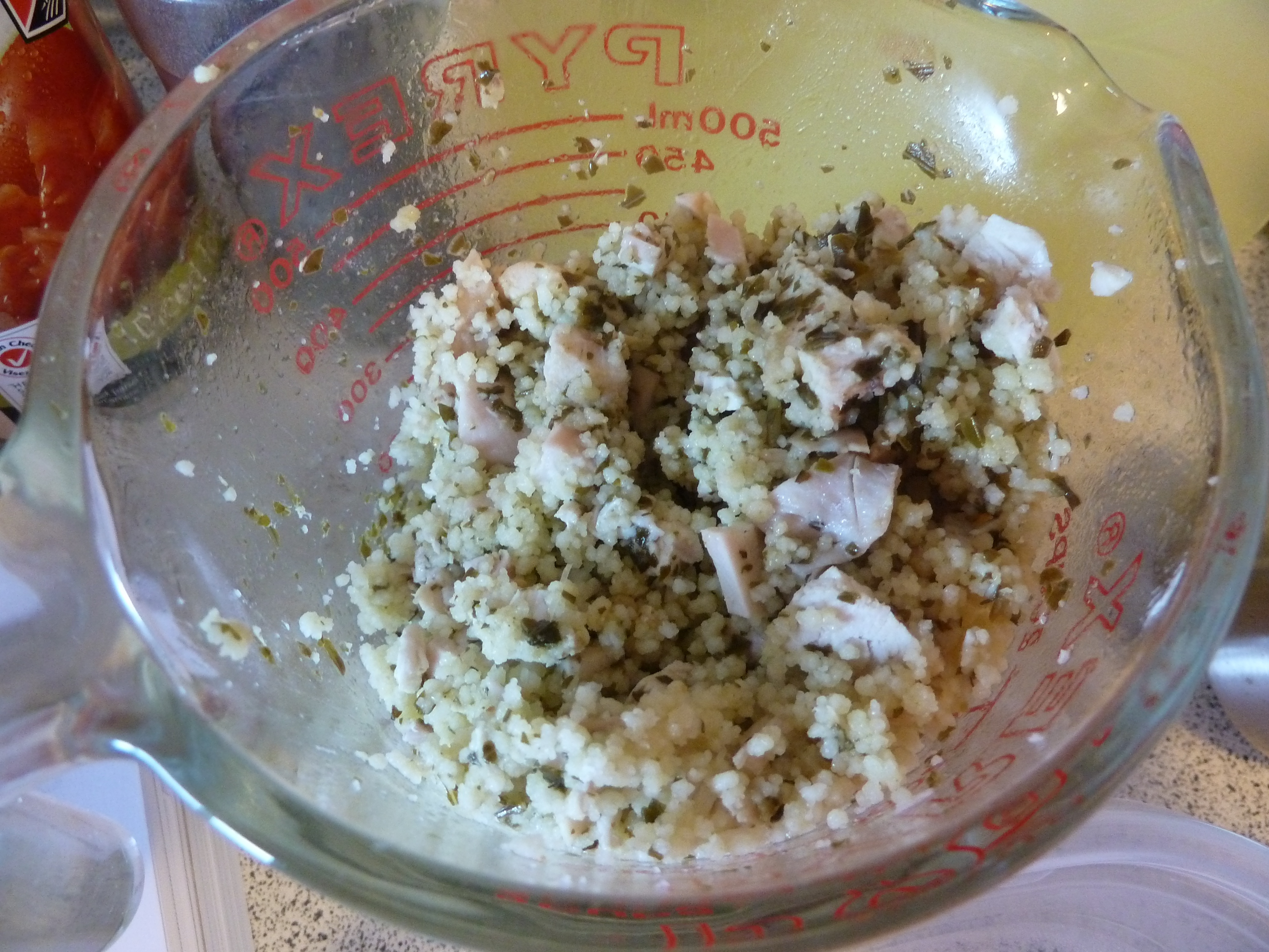 Red Pepper and Pesto Chicken Couscous: Add 1⁄4 cup (60 mL) chopped drained roasted red bell peppers (from a jar) with the chicken.