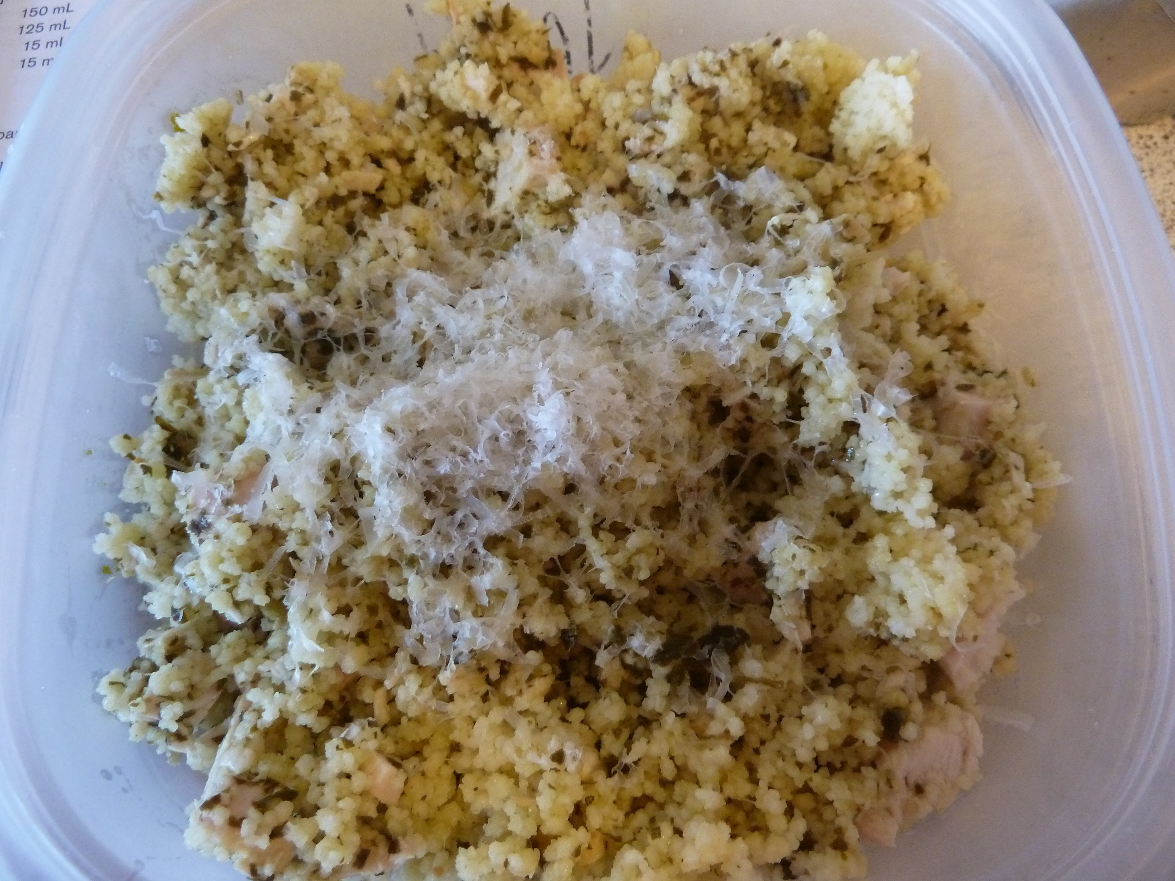 Fluff couscous with a fork. Stir in chicken and pesto. Microwave on High for 1 to 11⁄2 minutes or until heated through. Season to taste with salt and pepper, and sprinkle with Parmesan.