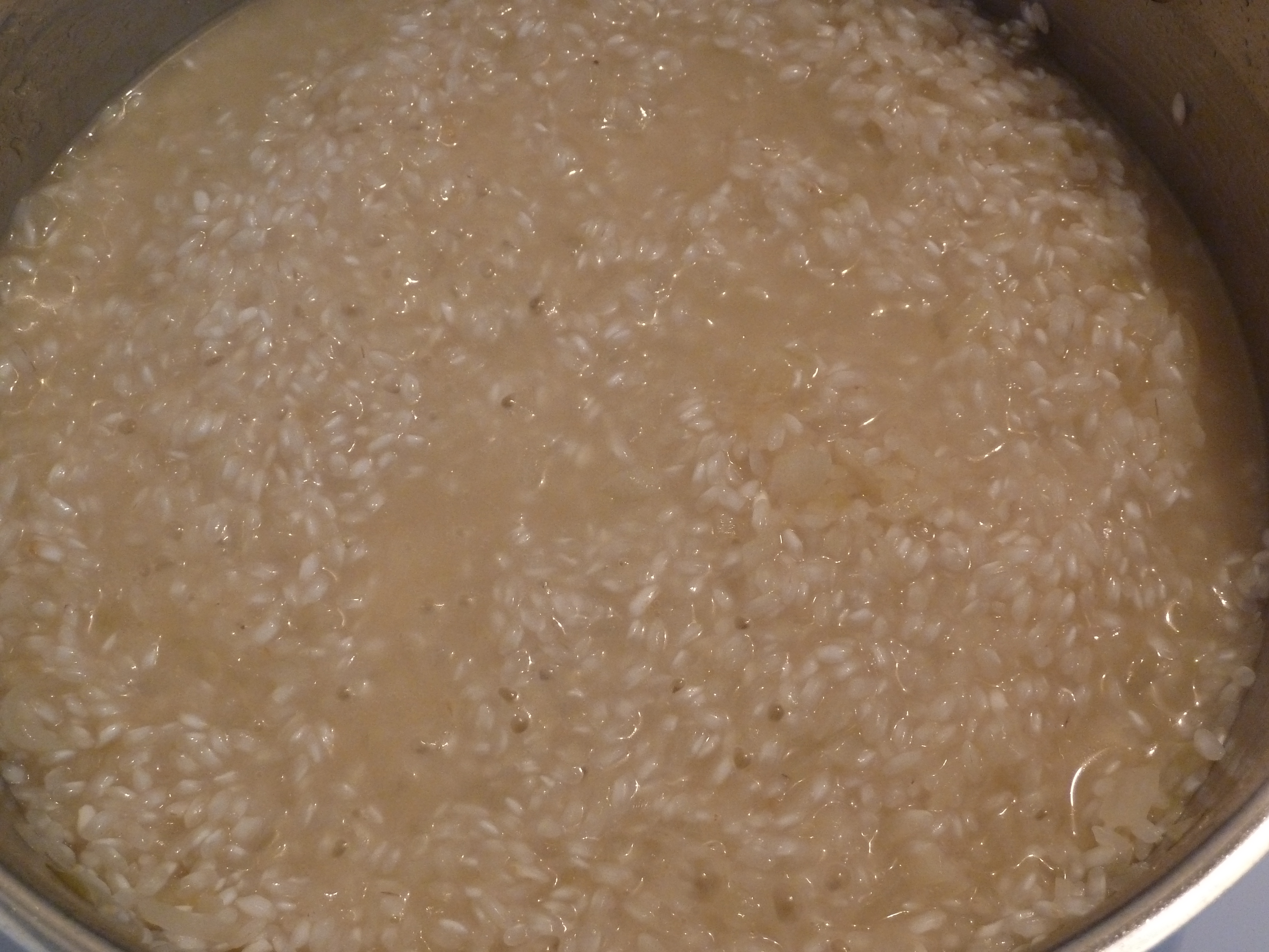 9) Add 1/2 cup white wine, stirring steadily until the wine is absorbed in the rice.