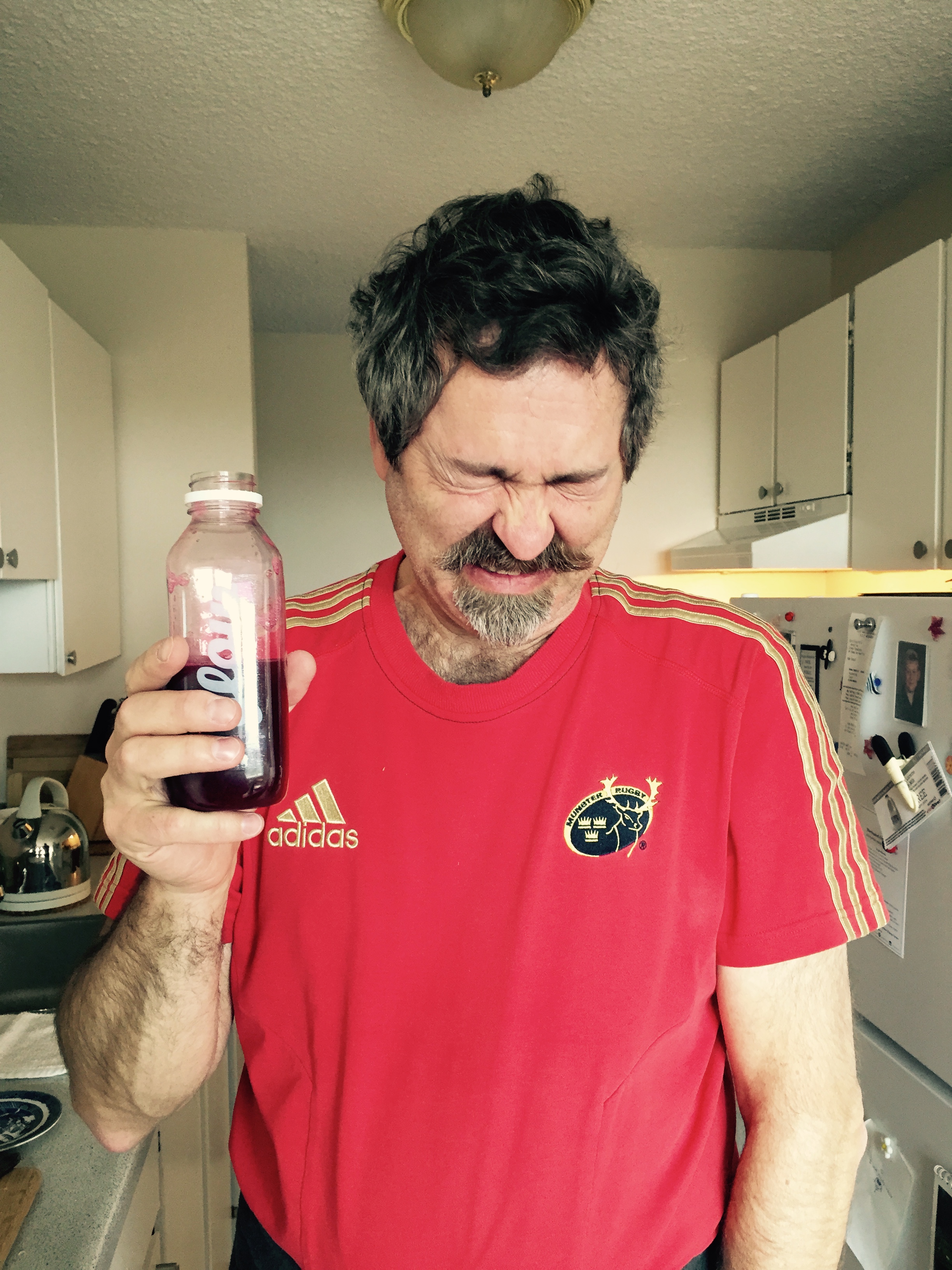 Still not feeling healthy, I thought it was a good time to have the first juice of my New Healthy Lifestyle. I selected the Earthy Glow juice, made with apple, beets, carrot, cucumber and ginger. If you are Weight Watchers follower, it works out to 6 points. I gave Michael a taste and he wasn’t all that impressed. See for yourself: