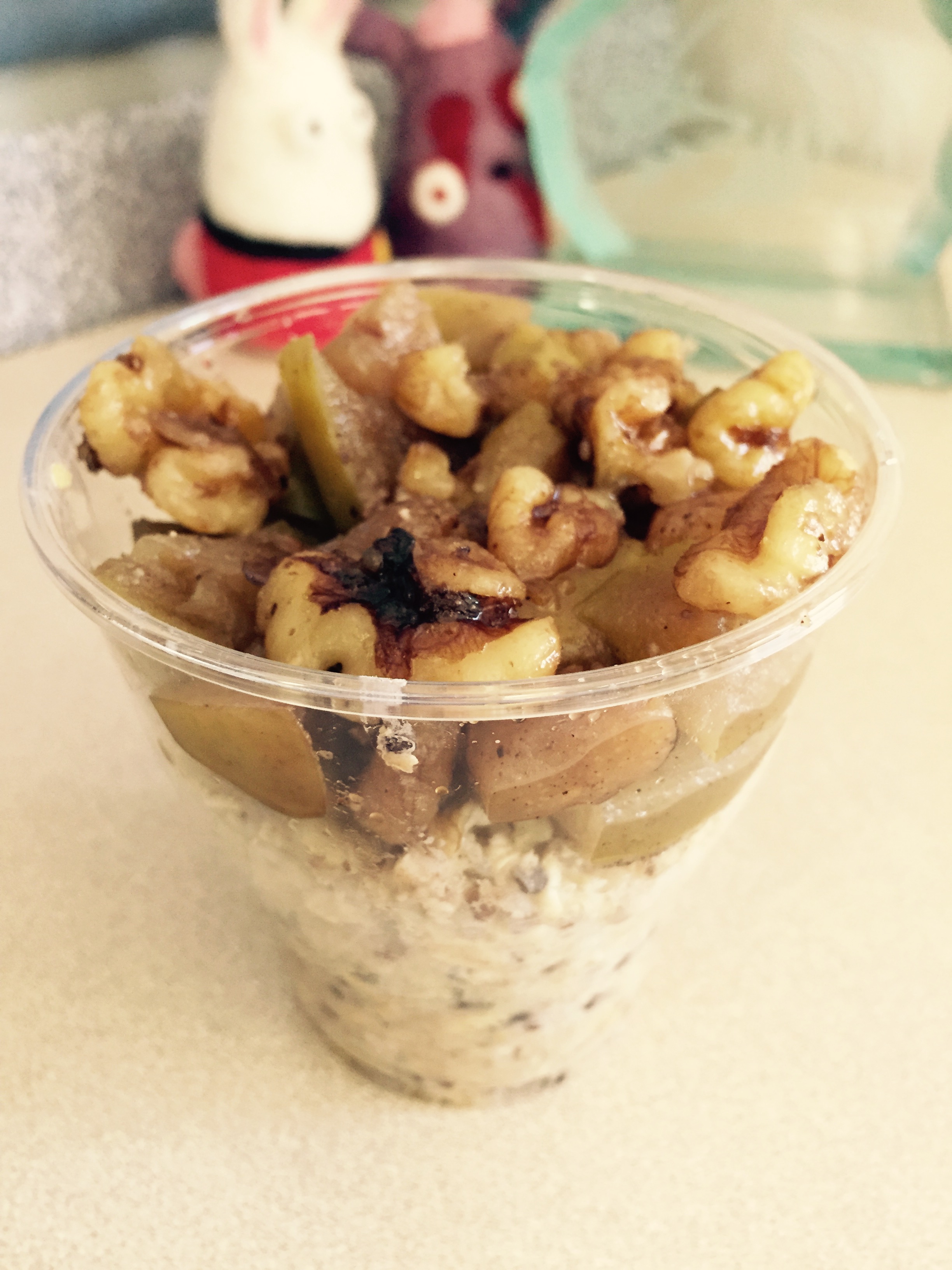 This particular item didn’t have a label on it, so I had to figure out what it was. On the base there, is a grain soaked in probably almond milk. I think I saw oatmeal and quinoa, possibly hemp. The topping was a delicious cinnamon infused fruit (apple or pear) and fresh walnuts. We were off to a good start.