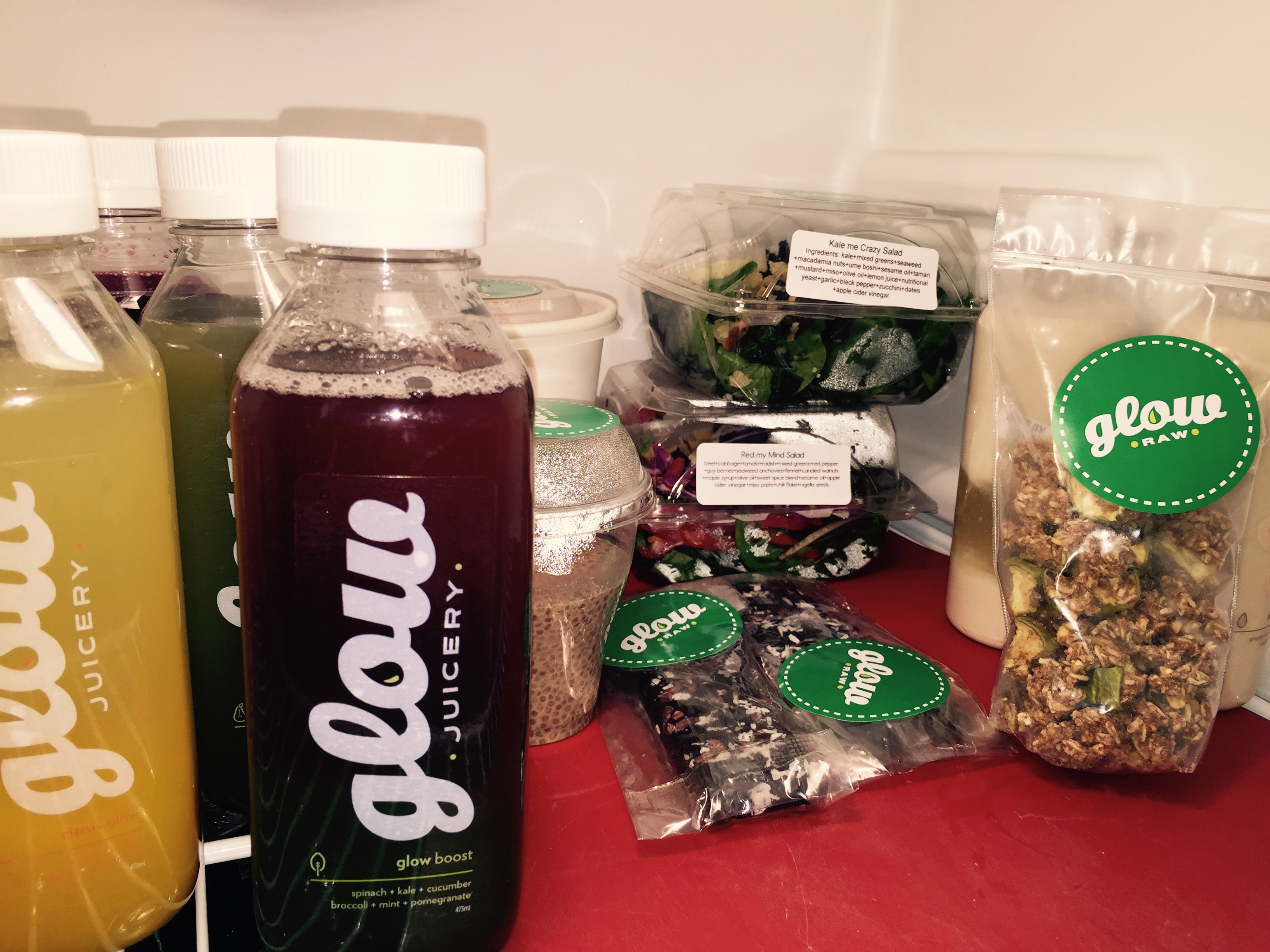 Just recovering from another cold, it seemed a good time to do a top to bottom spring clean of my body by feeding it nutrient dense, raw, vegan food and juice. For three days. For three days, quinoa, cabbage, tofu, miso, squash, nuts, seeds, and leafy greens. For three days. I’m done. I plead mercy, and bow deeply to those people who eat this gorgeous healthy food as a lifestyle choice. You cannot be impulsive to do the Raw Food + Juice Cleanse through Glow Juicery. You need to book it in advance, and also start a pre-cleanse routine before you get your food. You do this by eliminated caffeine, processed food, wheat, dairy, sugar and alcohol two days before your cleanse. And yes, a person could save themselves $165 and just cut out those foods from their diet and feel mighty fine. But what does $165 get you? Three breakfasts, three soups, three salads, three “energy snacks”, bottles of almond milk, bottles of fresh juice, a menu plan and a recommended eating schedule.